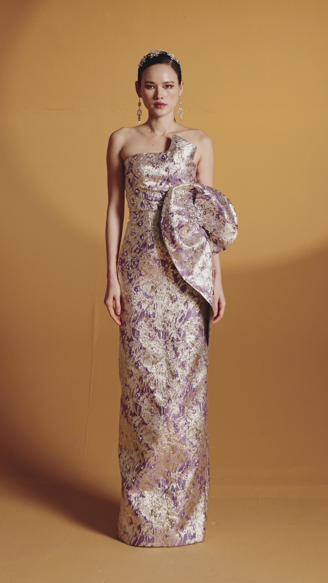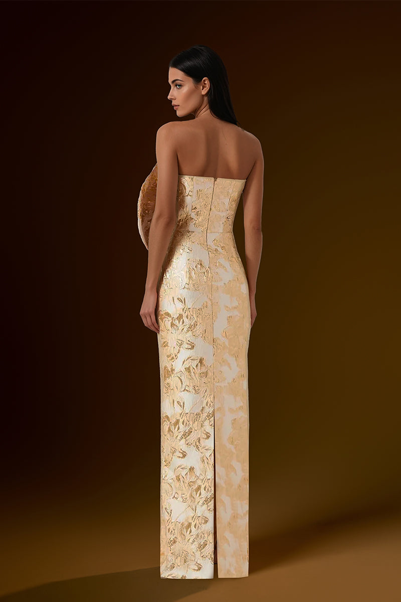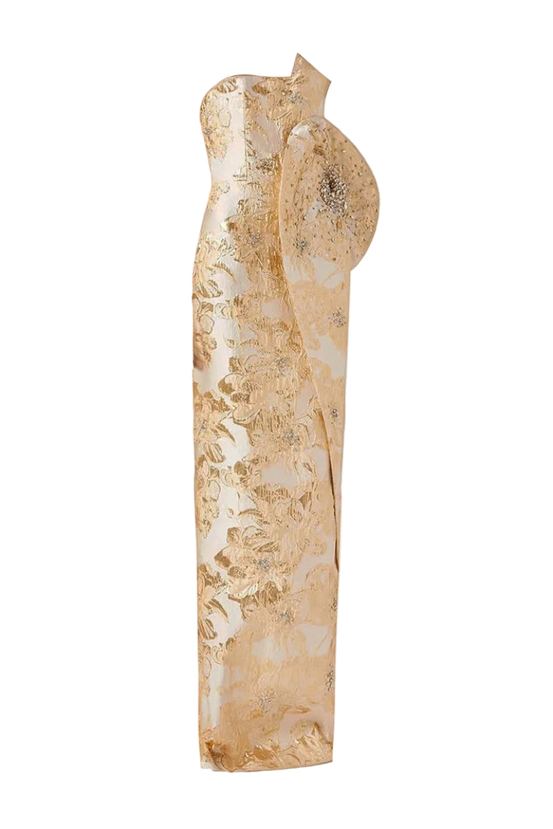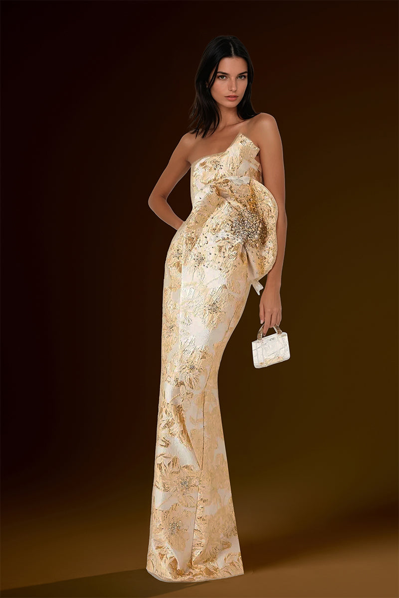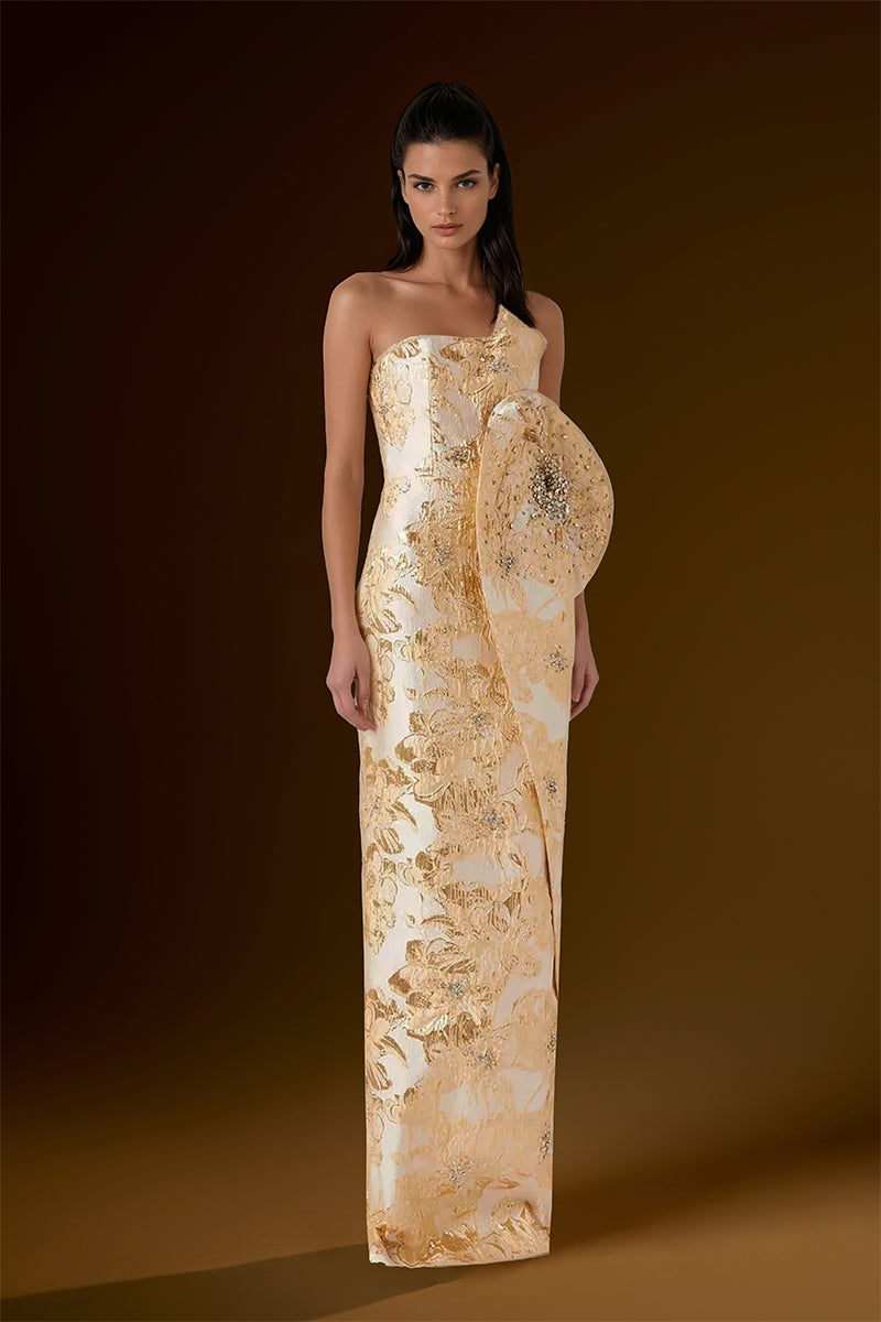 فستان بوستير بدون حمالات، رؤيةٌ من الفخامة والأناقة، ينضح بجمالٍ خالد. مصنوع من قماش الجاكار المعدني الفاخر، يتميز بتفاصيل أنيقة عند الخصر، تُبرز جمال قوامكِ برشاقة. مُرصّع بالكريستالات والأحجار البراقة، يأسركِ مع كل حركة، ما يجعله الخيار الأمثل لأمسيةٍ مفعمة بالرقي والتألق.