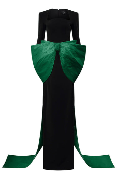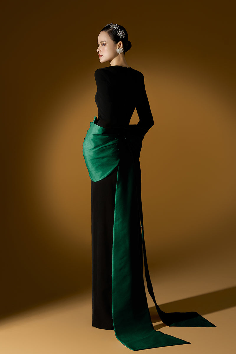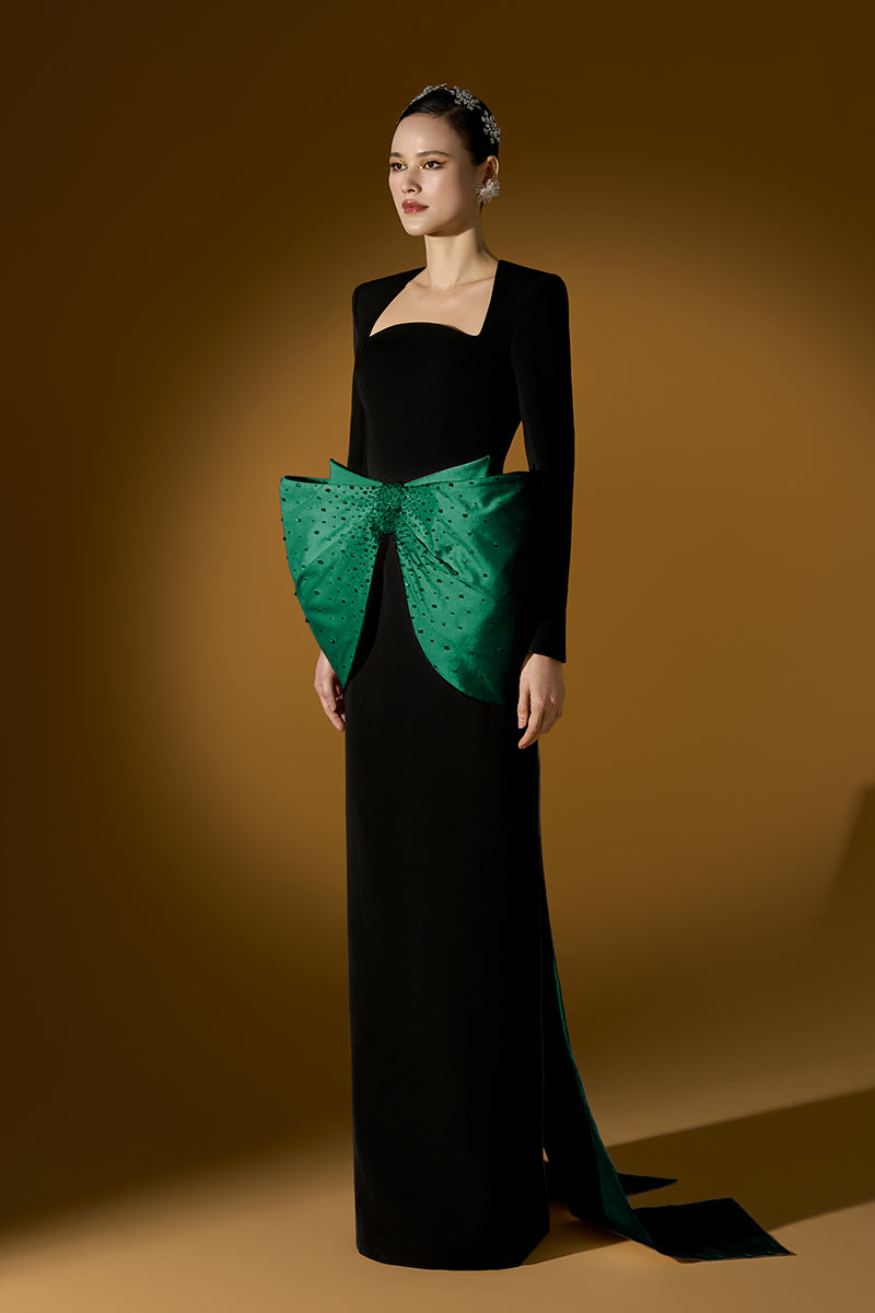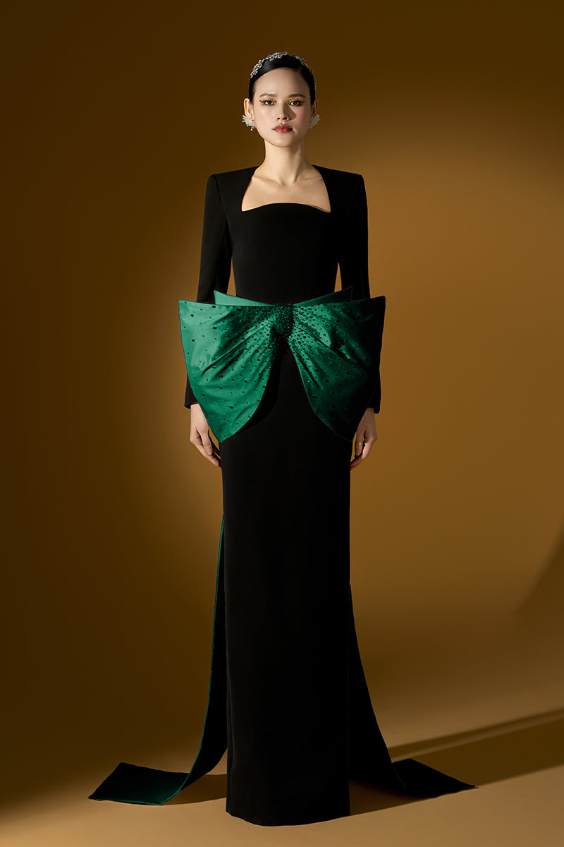هذا الفستان الطويل ذو التصميم العمودي يُجسّد جوهر الأناقة الراقية. يُضفي خط العنق شبه المنحرف والأكمام الطويلة المصنوعة من الكريب لمسةً أنيقةً ومنظمة، بينما تُضفي عقدة التفتا المُرصّعة بالكريستال عند الخصر لمسةً من التألق والرقي. صُنع الفستان من الكريب والتفتا الفاخرين، وينساب بسلاسة، مُفعمًا بالرقي والجمال العصري. مثاليٌّ لأمسيات أنيقة، سواءً كانت مناسبةً رسميةً أو عشاءً راقيًا أو احتفالًا راقيًا، حيث يمزج هذا التصميم بين السحر الكلاسيكي والرقي العصري، مما يسمح لمن ترتديه بالتألق بأناقةٍ خالدةٍ وعفوية.