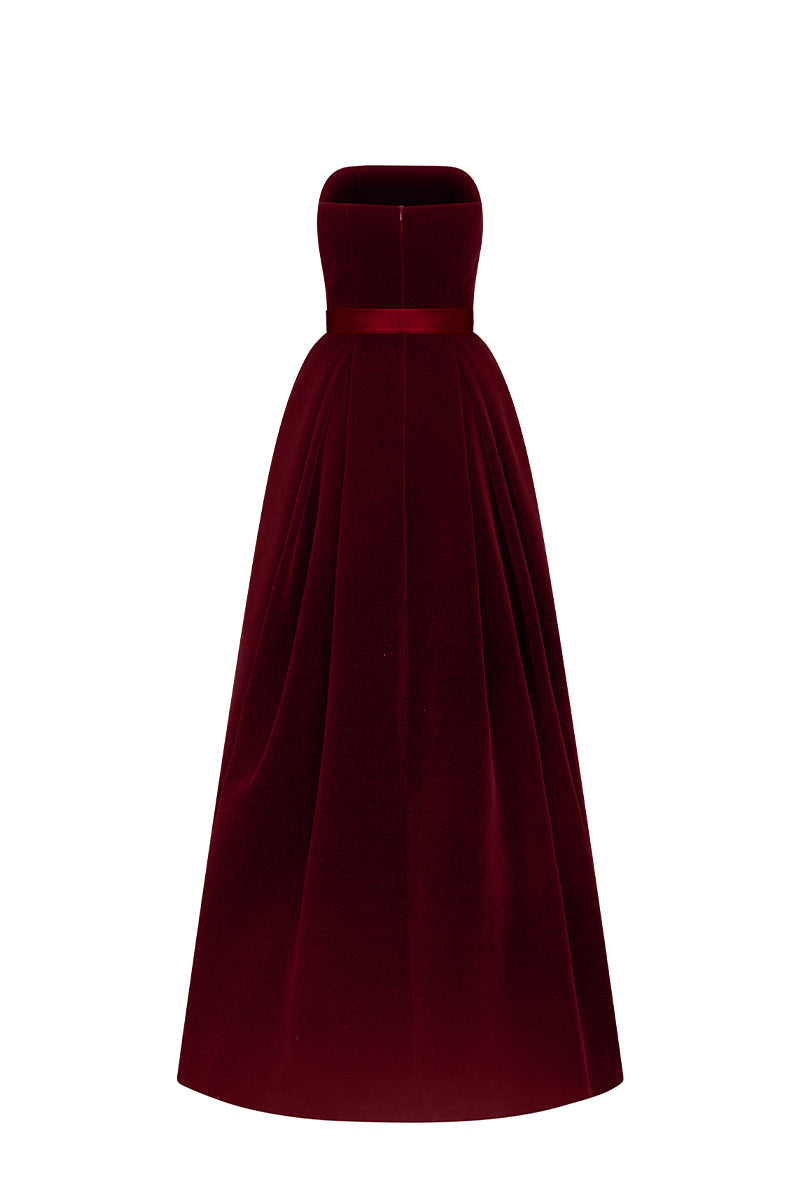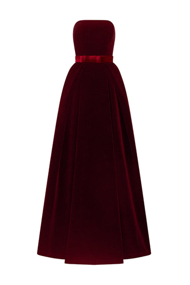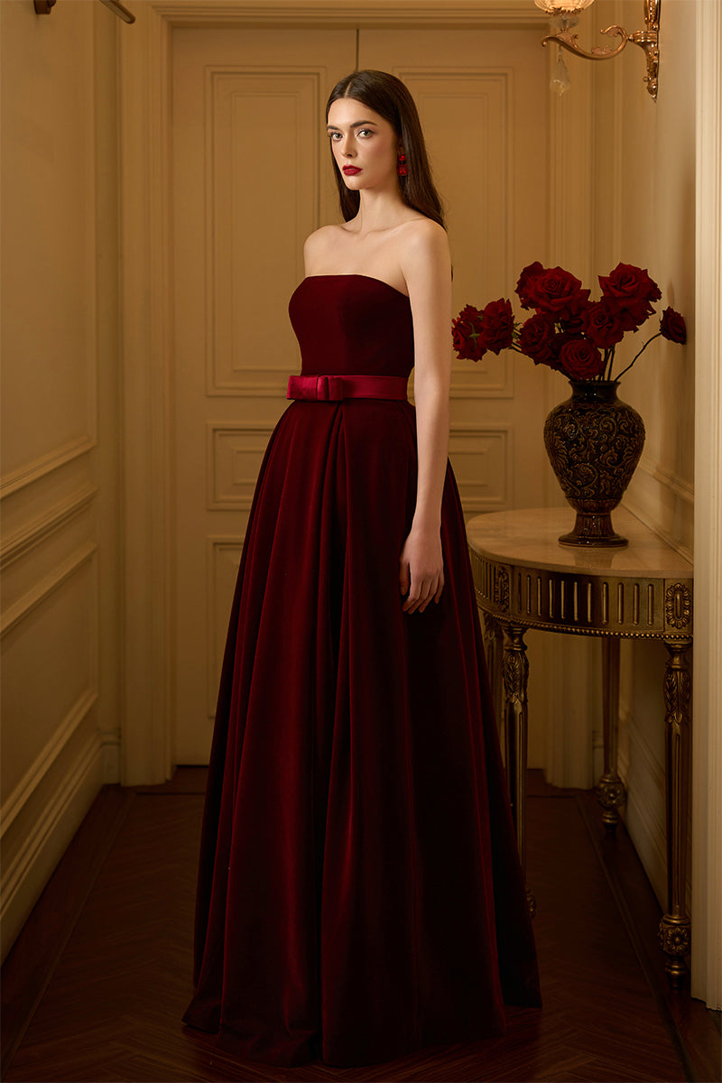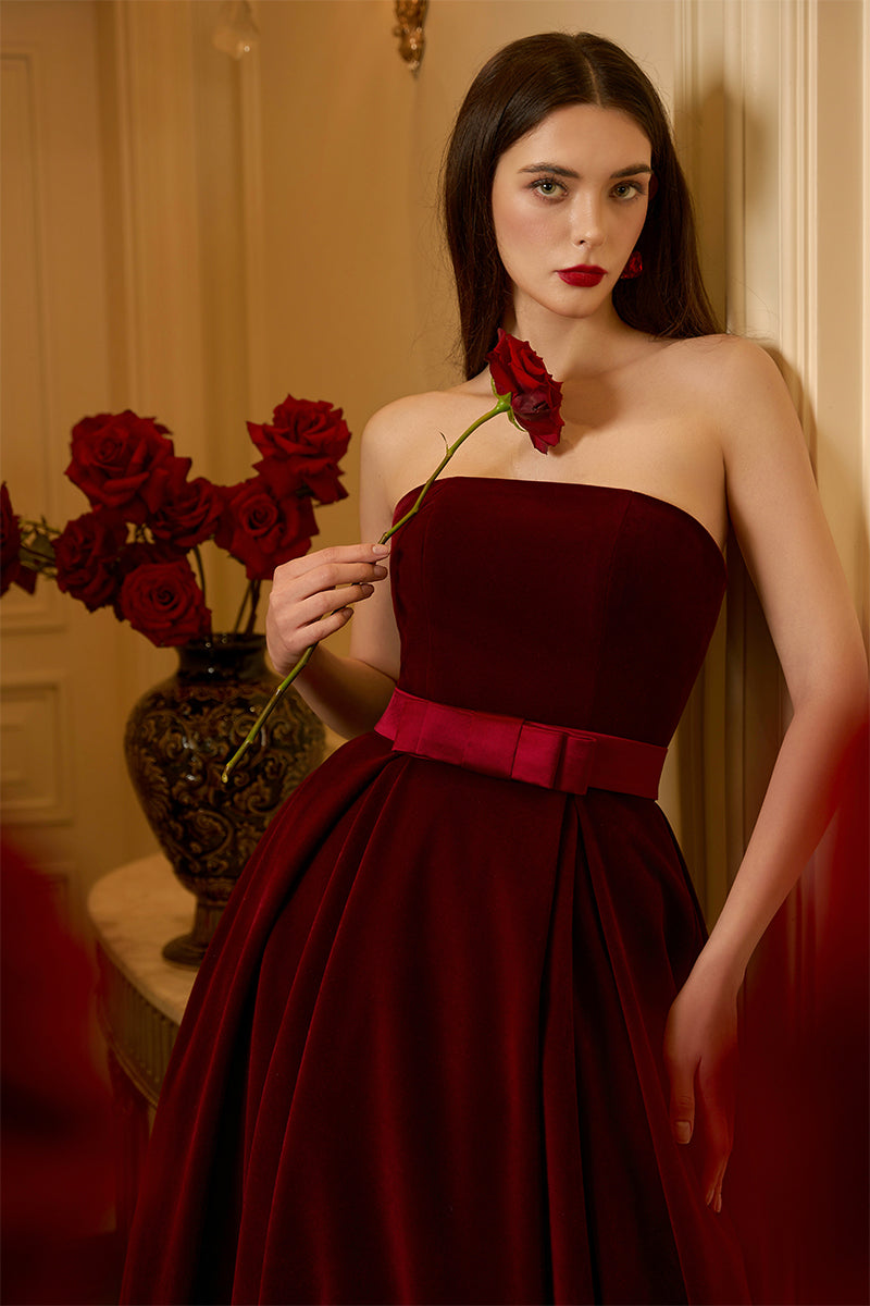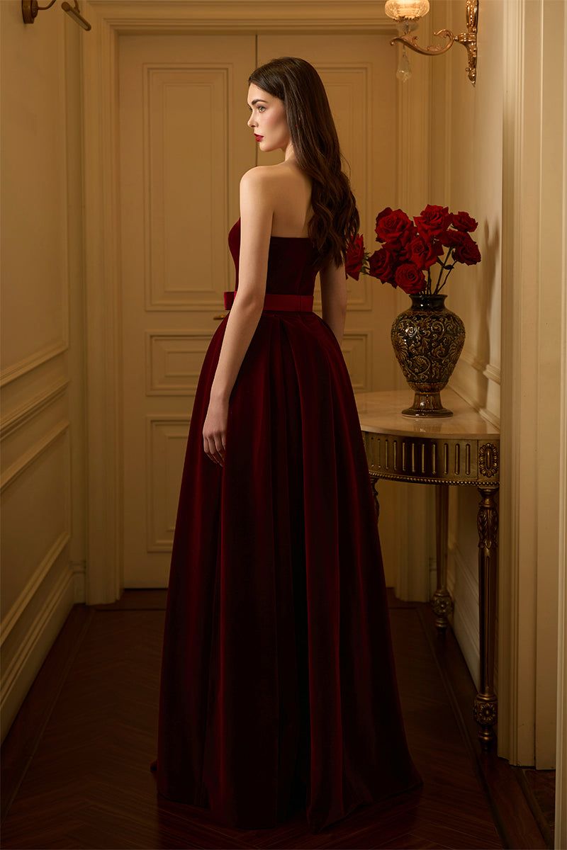 هذا الفستان ذو التصميم A، المصنوع من مخمل ليون الفاخر والحرير، ينضح بأناقة خالدة. تصميمه بدون أكمام وحمالات يُضفي عليه لمسةً من الأناقة، بينما يُضفي الصدر المطوي لمسةً من الأناقة والجمال على التصميم. حزام خصر حريري مع فيونكة صغيرة بحلقتين يُحكم الخصر، مما يُضفي عليه مظهرًا أنيقًا وجذابًا. تصميم الفستان الانسيابي على شكل A يُضفي عليه لمسةً من الرقي والحركة، مما يجعله الخيار الأمثل لأي مناسبة أنيقة.