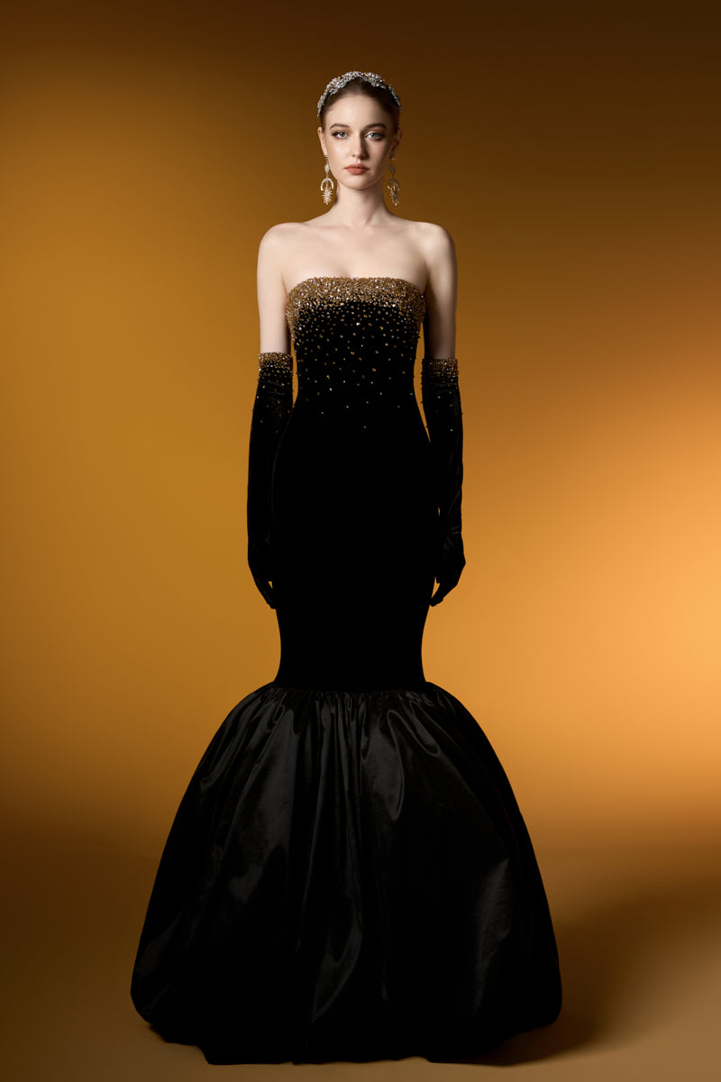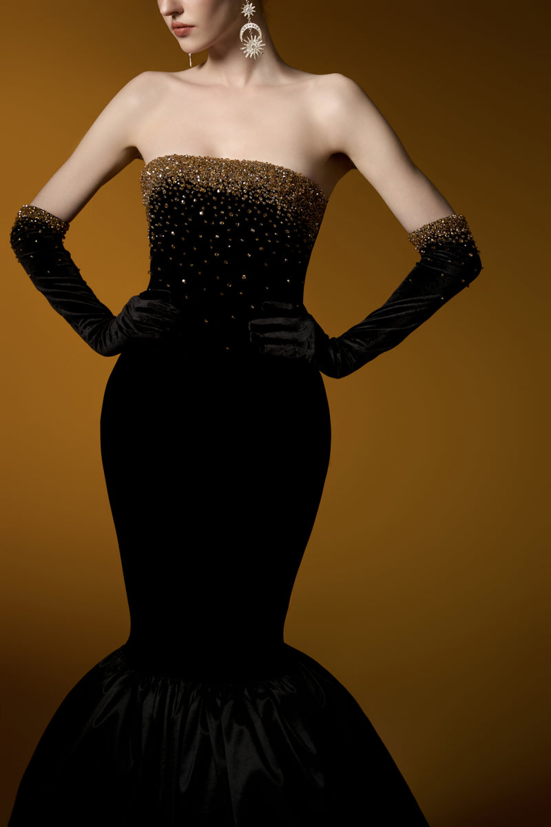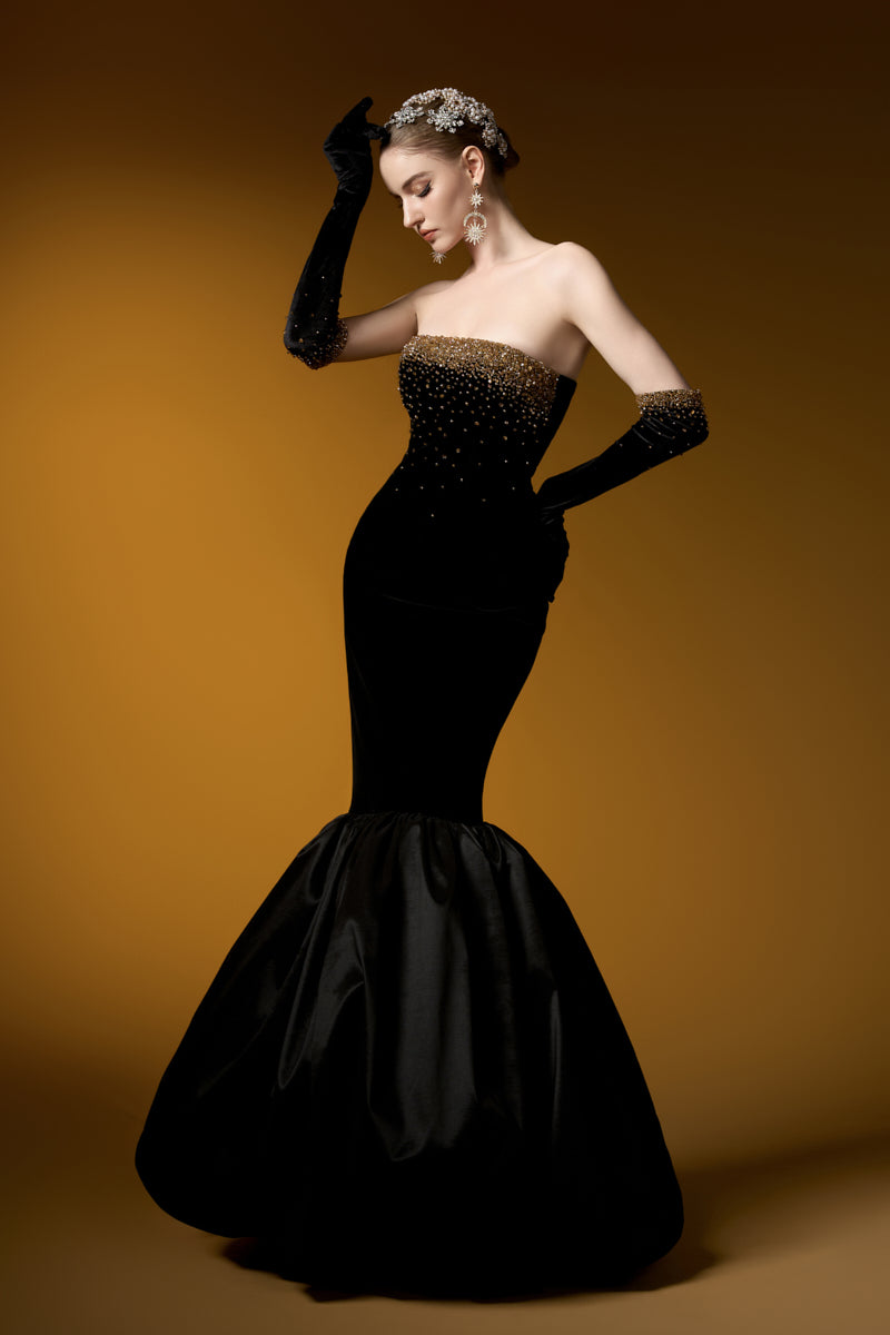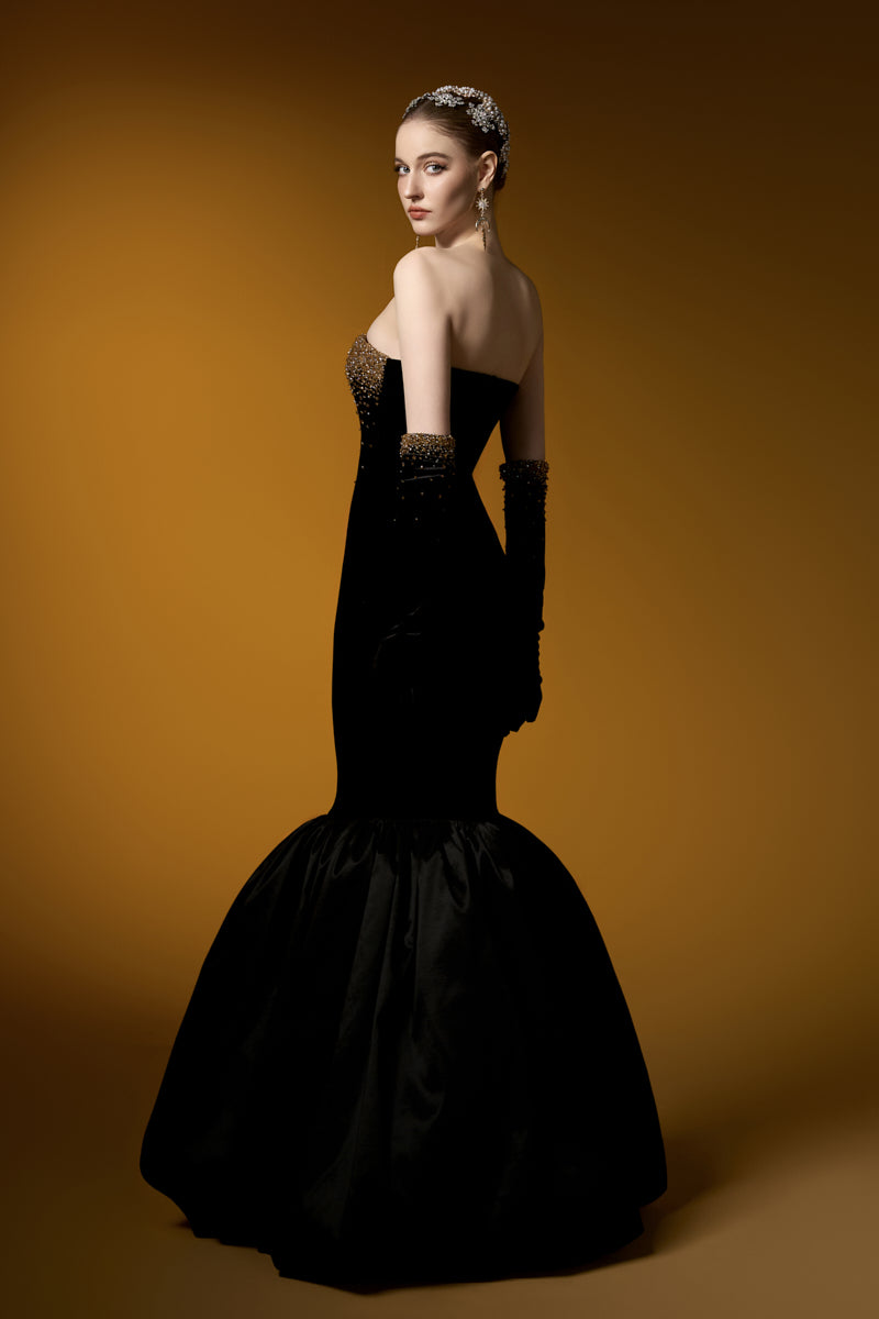 هذا الفستان الأسود المخملي بدون حمالات، ذو الصدر المزين بصدرية، يشعّ بالأناقة والفخامة. قماش ليون المخملي يعانق الجسم بجمال، بينما تضفي كشاكش التفتا الفاخرة حول الحافة لمسةً ساحرة. يكتمل هذا الفستان بقفازات مخملية، مزين بكريستالات متلألئة تتدلى برقة من خط الصدر، مما يخلق تأثيرًا ساحرًا. مصنوع من أجود أنواع مخمل ليون والتفتا، إنه الخيار الأمثل لأمسية لا تُنسى من الأناقة والرقي.