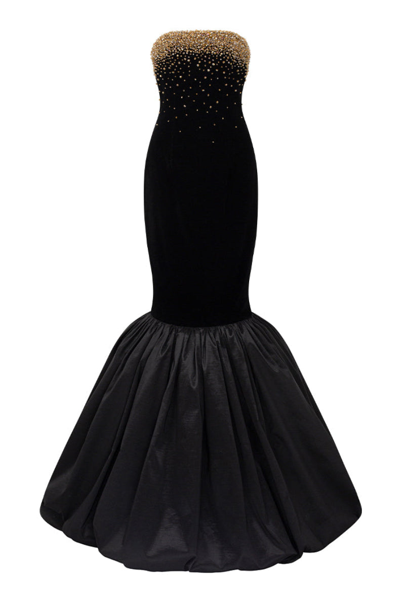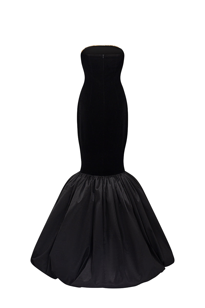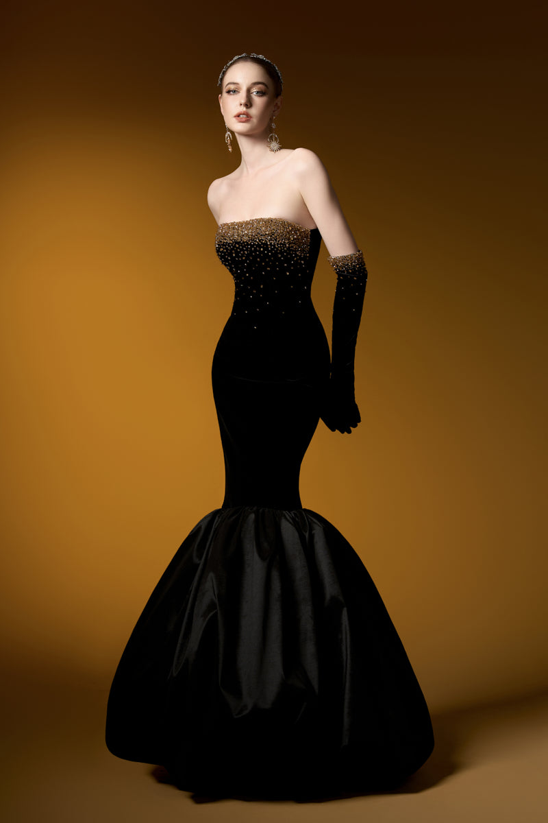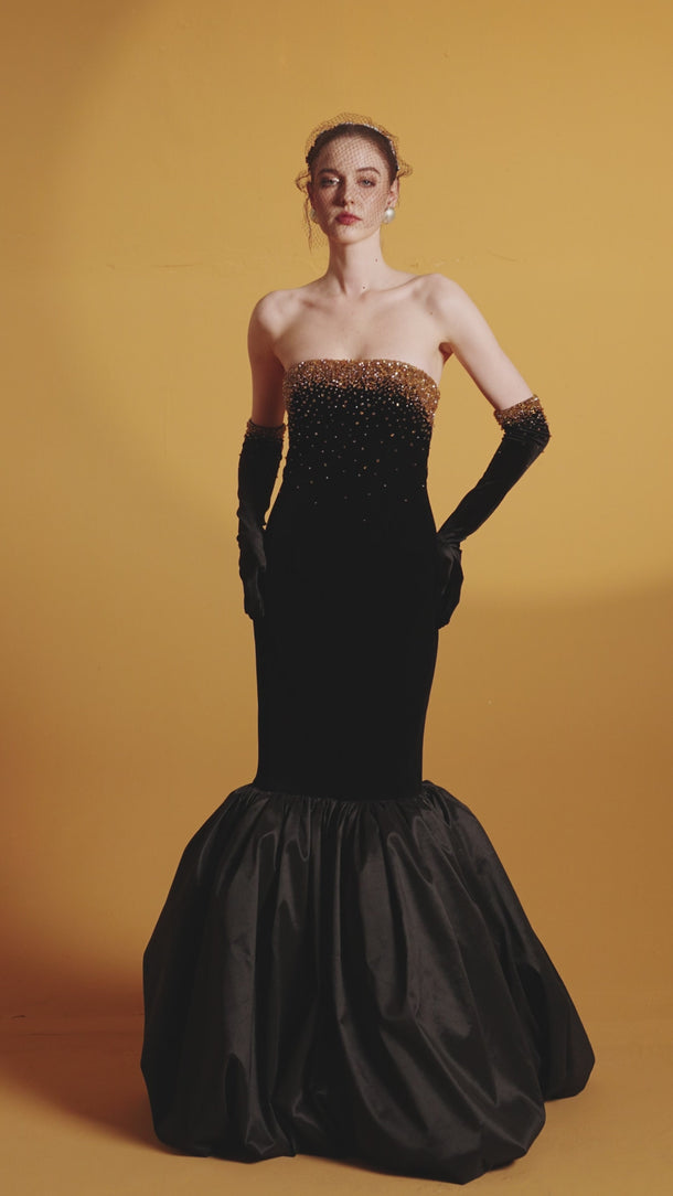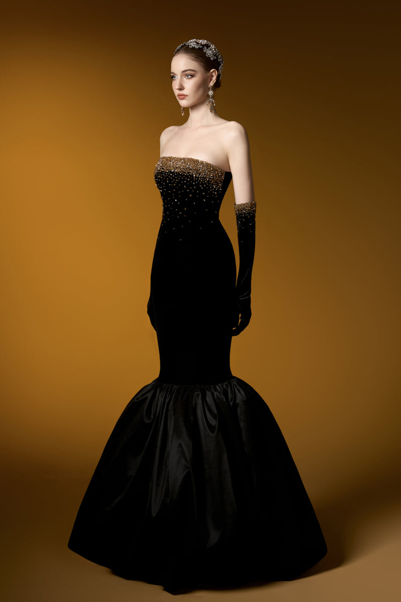 هذا الفستان الأسود المخملي بدون حمالات، ذو الصدر المزين بصدرية، يشعّ بالأناقة والفخامة. قماش ليون المخملي يعانق الجسم بجمال، بينما تضفي كشاكش التفتا الفاخرة حول الحافة لمسةً ساحرة. يكتمل هذا الفستان بقفازات مخملية، مزين بكريستالات متلألئة تتدلى برقة من خط الصدر، مما يخلق تأثيرًا ساحرًا. مصنوع من أجود أنواع مخمل ليون والتفتا، إنه الخيار الأمثل لأمسية لا تُنسى من الأناقة والرقي.