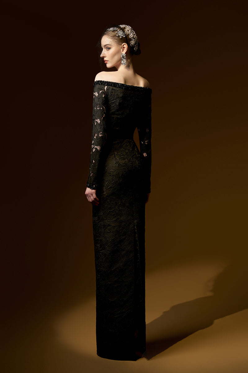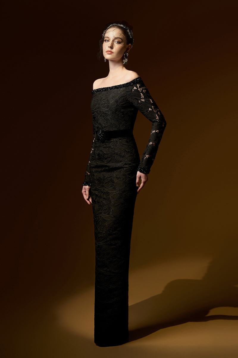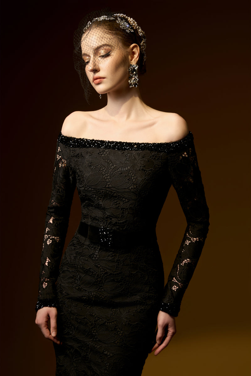 هذا الفستان الأسود الطويل ذو الأكتاف المكشوفة، يُضفي لمسةً من الأناقة والرقي الخالدين. تُضفي الأكمام الطويلة من الدانتيل المُطرّز لمسةً رقيقة، بينما تُضفي الكريستالات التي تُزيّن خط العنق وحواف الأكمام بريقًا رقيقًا ومُشرقًا. صُنع الفستان من دانتيل الجبير الفاخر والتفتا، ويتدلّى برشاقة، مُوفرًا توازنًا مثاليًا بين البنية والانسيابية. خيارٌ رائعٌ للمناسبات المسائية الراقية، سواءً كانت حفلًا كبيرًا، أو احتفالًا رسميًا، أو عشاءً حميميًا، فقد صُمّم هذا الفستان ليترك انطباعًا أنيقًا لا يُنسى.