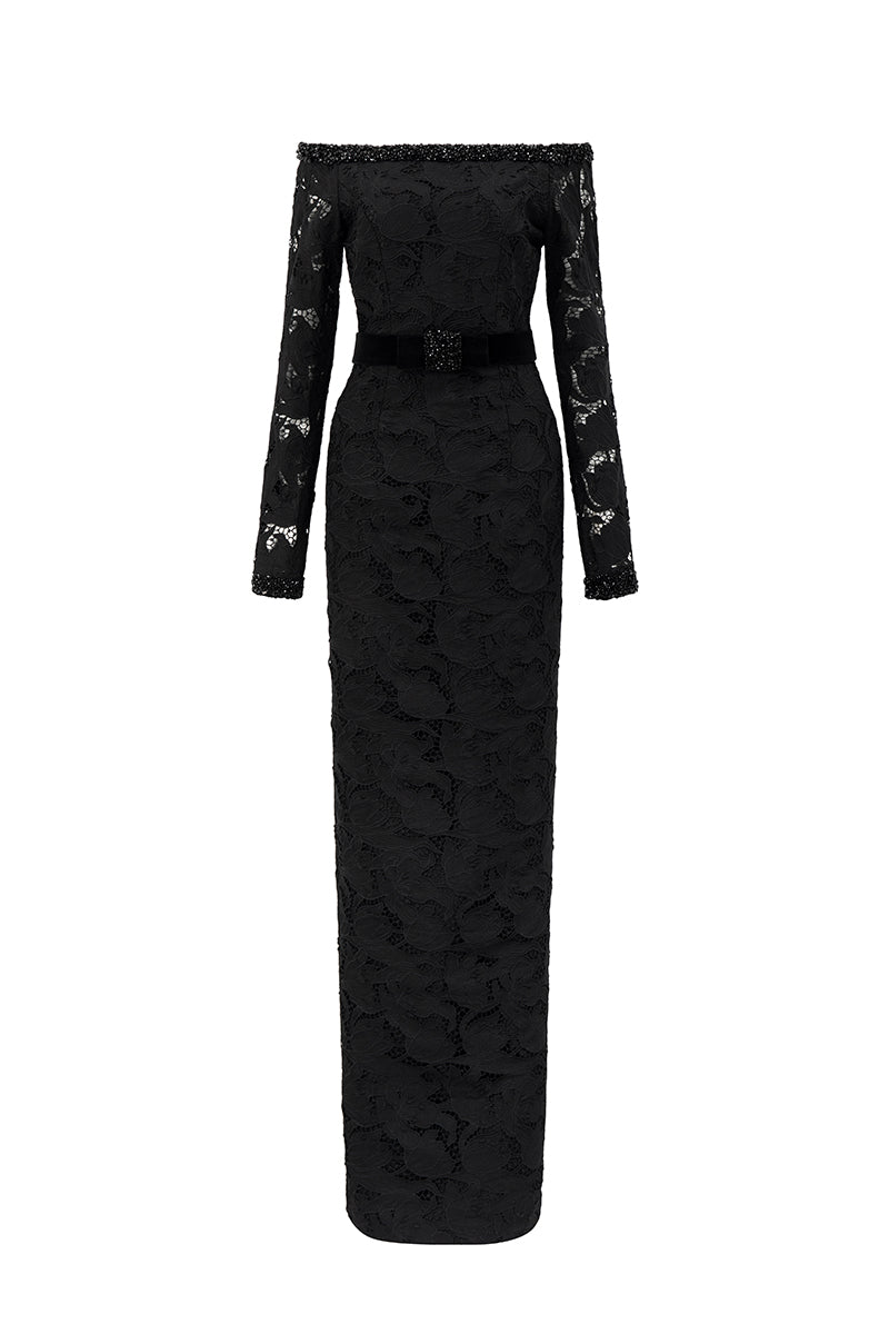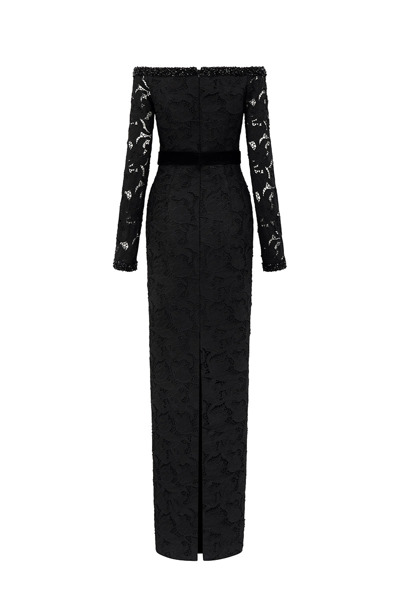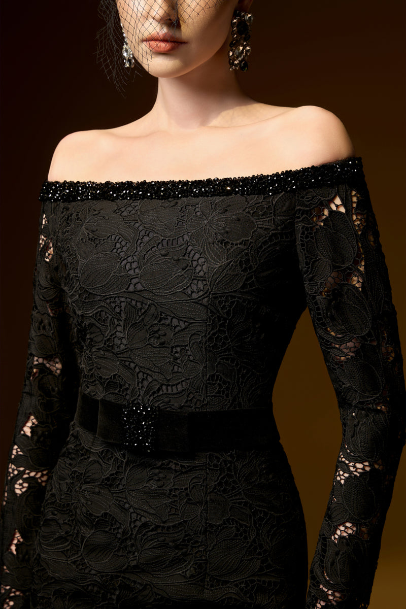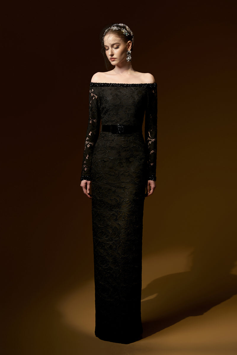 هذا الفستان الأسود الطويل ذو الأكتاف المكشوفة، يُضفي لمسةً من الأناقة والرقي الخالدين. تُضفي الأكمام الطويلة من الدانتيل المُطرّز لمسةً رقيقة، بينما تُضفي الكريستالات التي تُزيّن خط العنق وحواف الأكمام بريقًا رقيقًا ومُشرقًا. صُنع الفستان من دانتيل الجبير الفاخر والتفتا، ويتدلّى برشاقة، مُوفرًا توازنًا مثاليًا بين البنية والانسيابية. خيارٌ رائعٌ للمناسبات المسائية الراقية، سواءً كانت حفلًا كبيرًا، أو احتفالًا رسميًا، أو عشاءً حميميًا، فقد صُمّم هذا الفستان ليترك انطباعًا أنيقًا لا يُنسى.