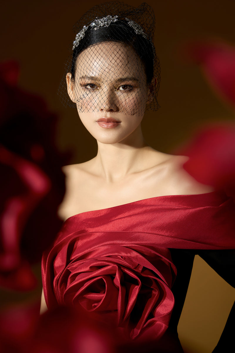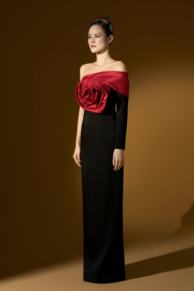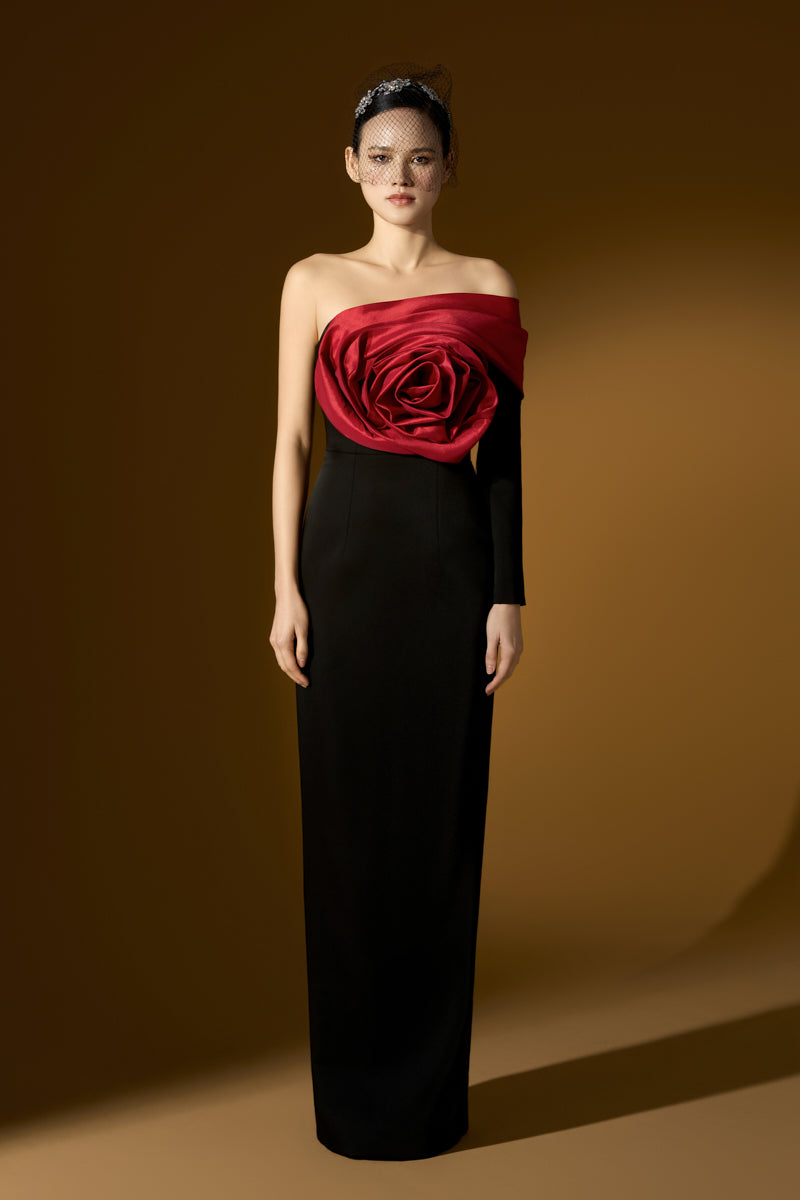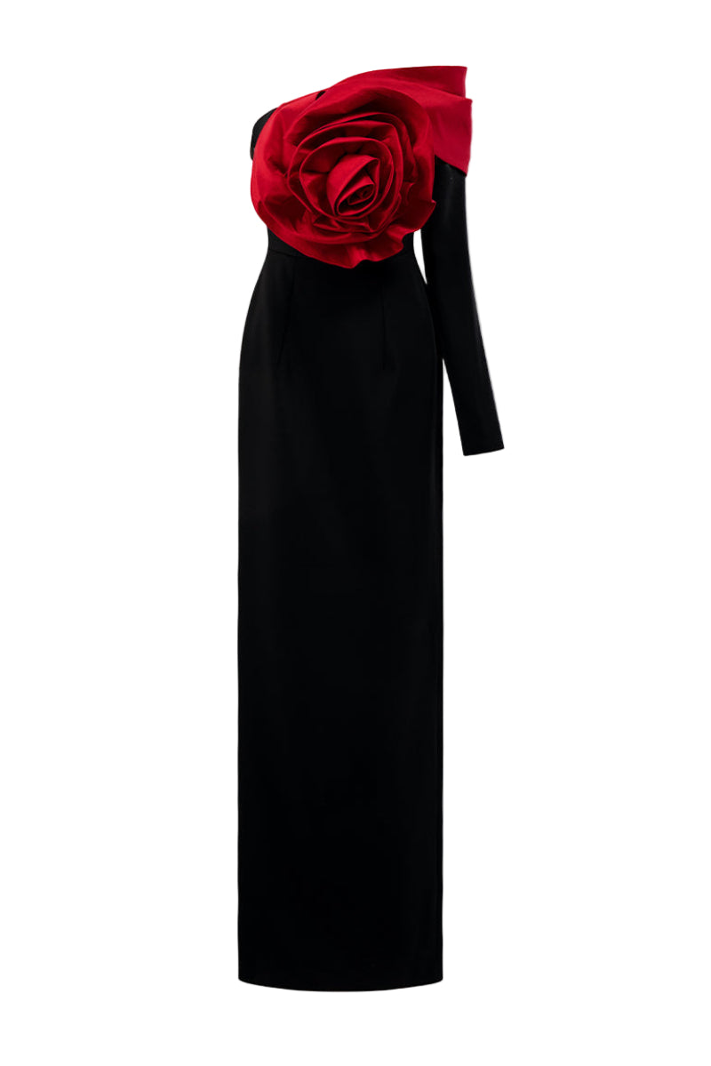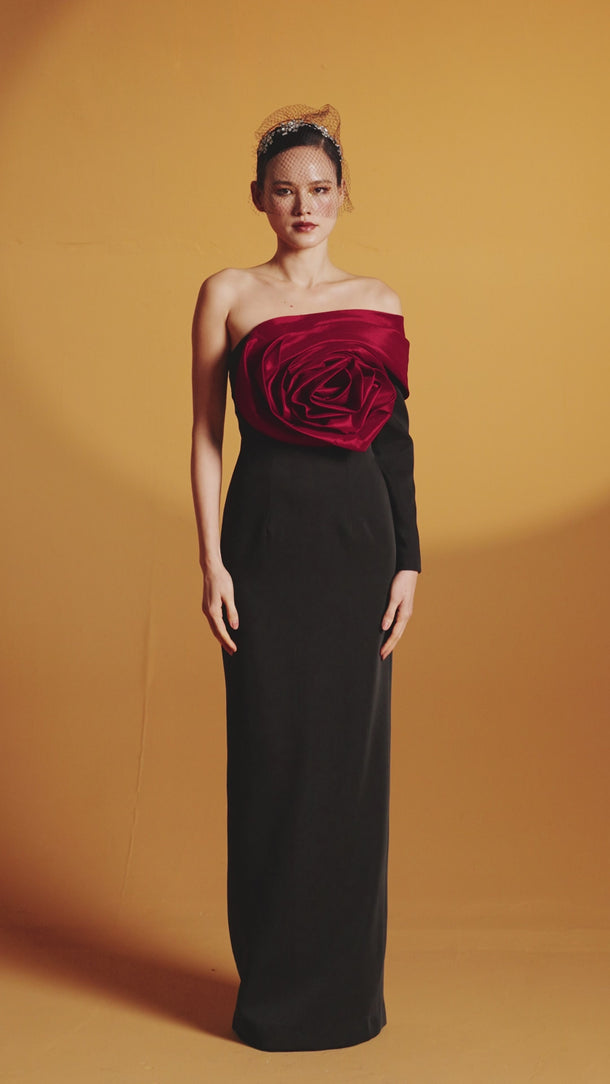 هذا الفستان العمودي غير المتماثل، بطول الأرض وبدون حمالات، مكشوف الأكتاف، ينضح بأناقة جريئة ورقيًا عصريًا. يتميز بأكمام طويلة جذابة على أحد الجانبين، مما يخلق عدم تناسق لافت، بينما تضفي الوردة المبالغ فيها، المصنوعة يدويًا من قماش التفتا، على الصدر، لمسة فنية ونحتية. مصنوع من الكريب الفاخر، يحتضن هذا الفستان الجسم بأناقة وتناسق، ليُضفي عليه لمسة من الرقي والجمال الخالد. مثالي لمن تبحث عن التميز بأناقتها وذوقها الرفيع.