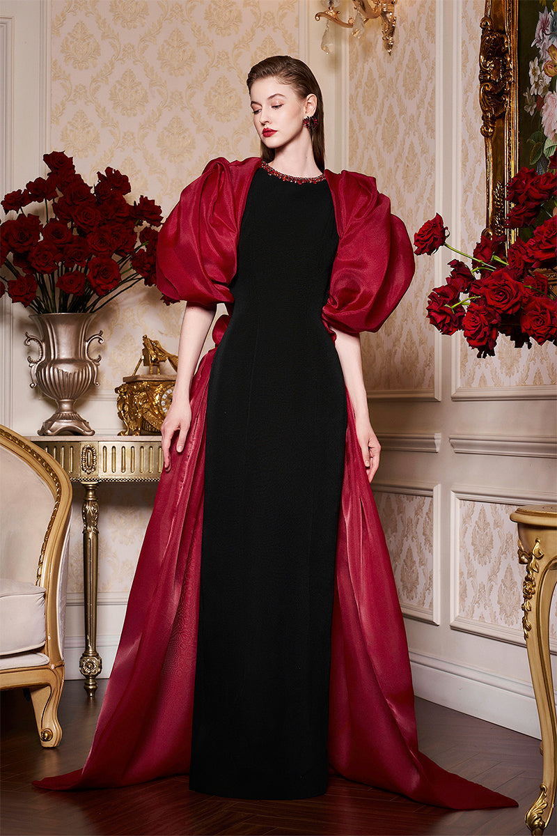 فستان سهرة من قماش السكوبا بقصّة مستقيمة ورقبة دائرية مرصعة بالكريستال مع أكمام درابيه من الأورجانزا.