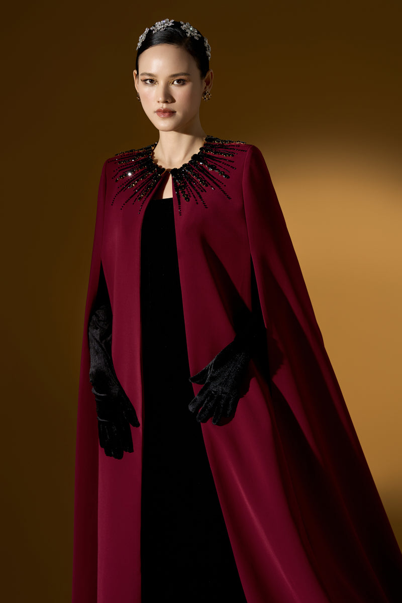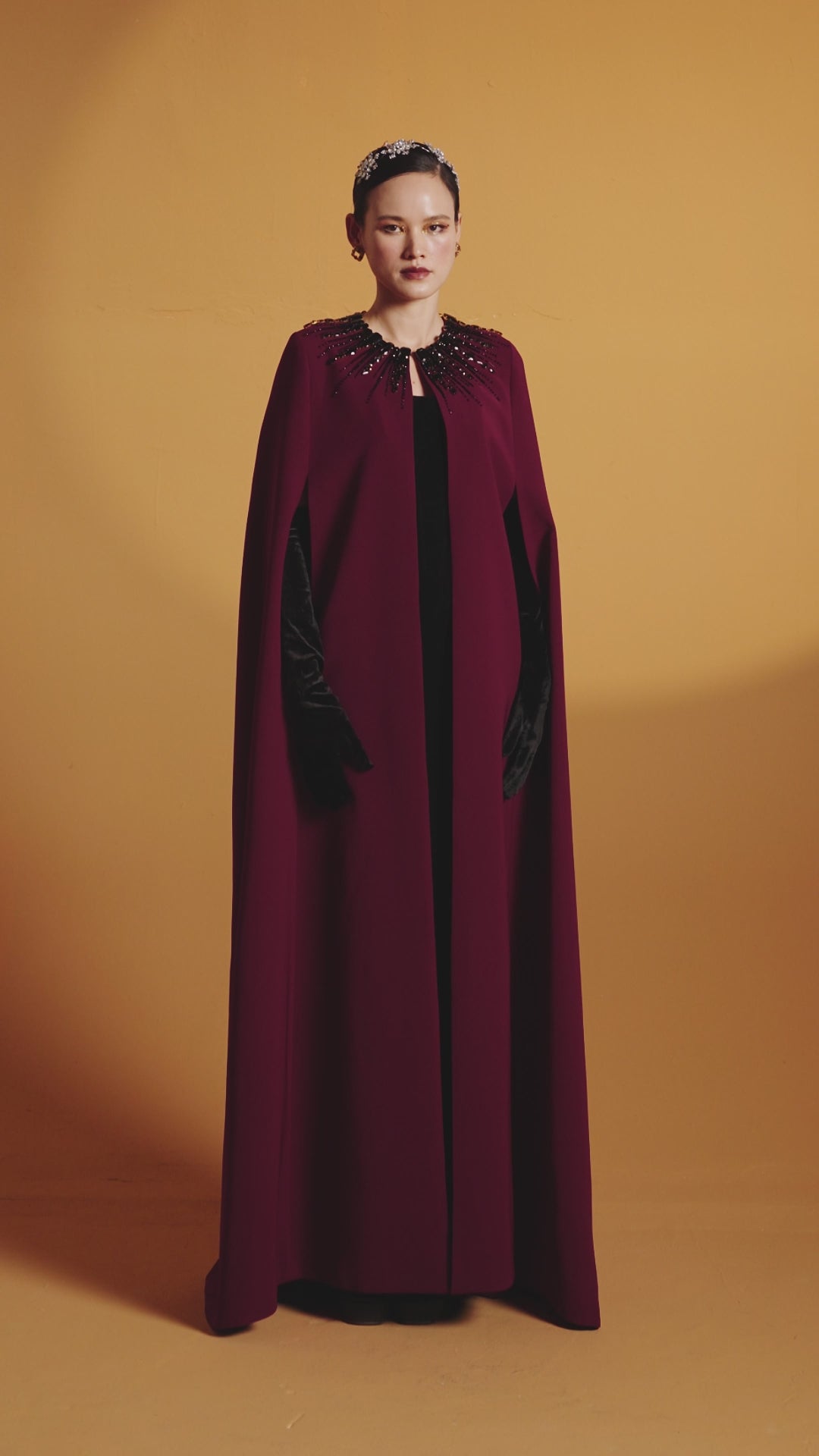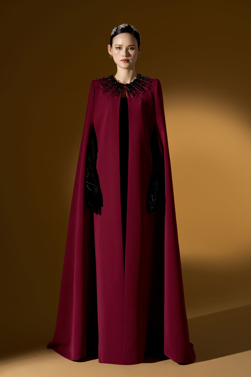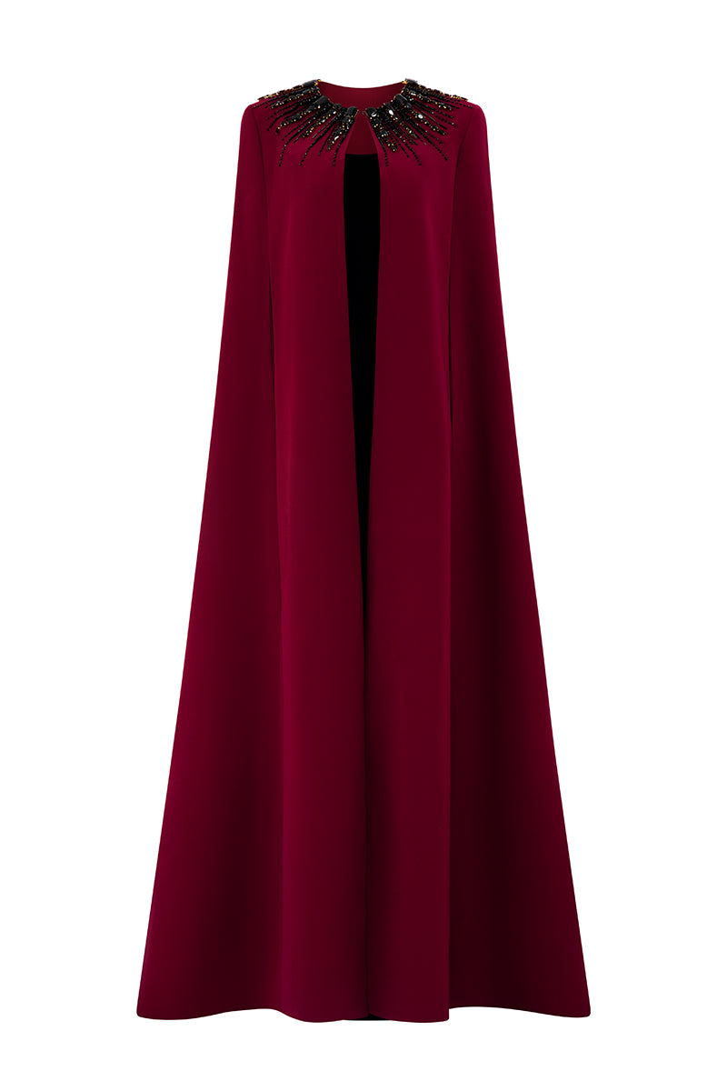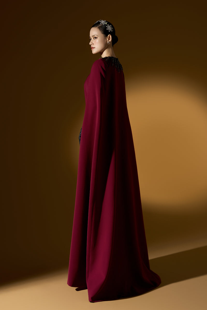 هذا الفستان الأحمر الداكن الطويل بدون حمالات، بتصميم عمودي، قطعة فنية مبهرة، مصنوع من مخمل ليون الفاخر، ليمنحكِ إطلالة جذابة تُبرز جمال قوامكِ. يُرتدى مع عباءة طويلة فاخرة من الكريب، والعباءة الخارجية مزينة بأحجار وكريستالات تتدلى حول فتحة العنق المستديرة، مما يُضفي لمسة راقية من الأناقة. يجمع الفستان بين الرقي والفخامة العصرية، ليُصبح قطعة خالدة تشع أناقةً وجاذبية.