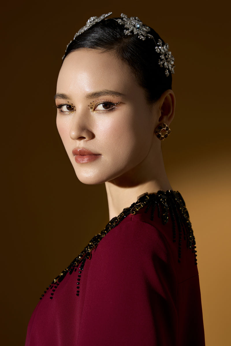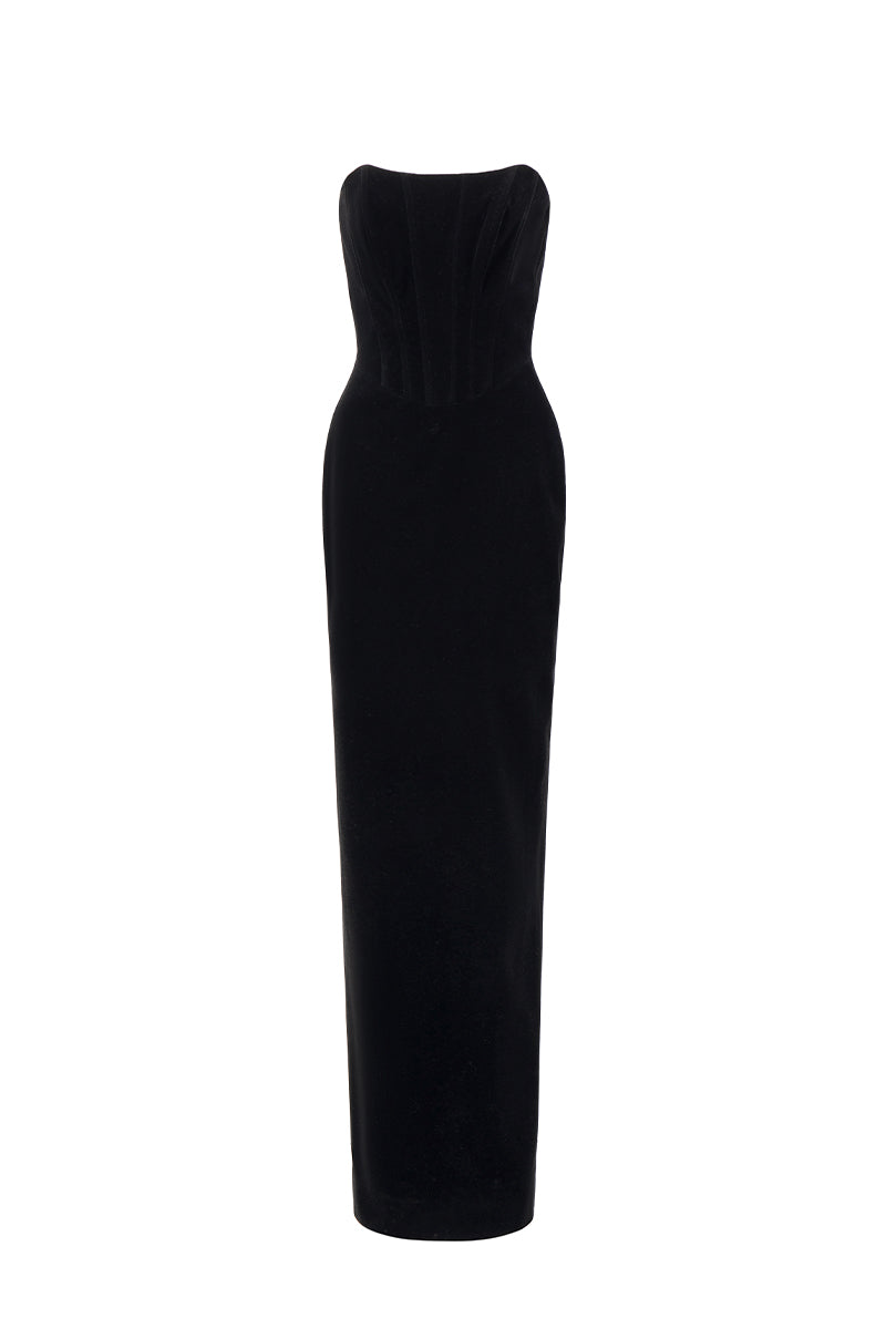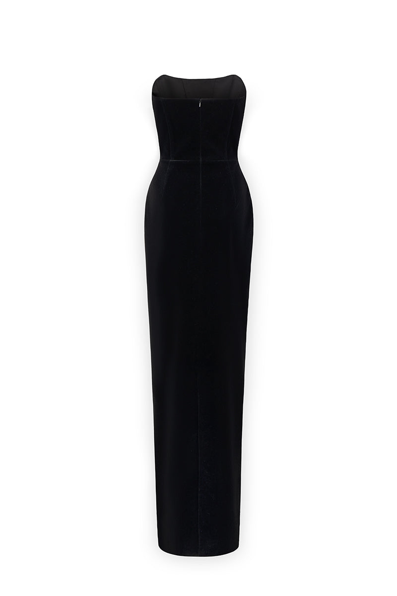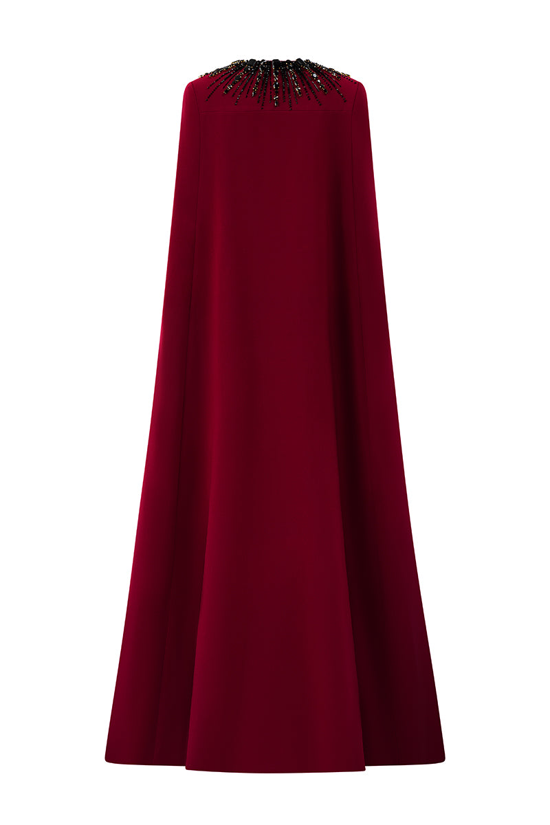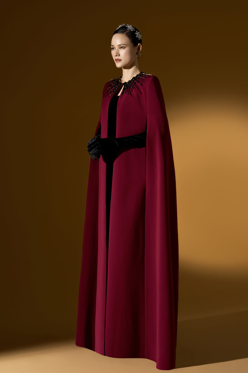 هذا الفستان الأحمر الداكن الطويل بدون حمالات، بتصميم عمودي، قطعة فنية مبهرة، مصنوع من مخمل ليون الفاخر، ليمنحكِ إطلالة جذابة تُبرز جمال قوامكِ. يُرتدى مع عباءة طويلة فاخرة من الكريب، والعباءة الخارجية مزينة بأحجار وكريستالات تتدلى حول فتحة العنق المستديرة، مما يُضفي لمسة راقية من الأناقة. يجمع الفستان بين الرقي والفخامة العصرية، ليُصبح قطعة خالدة تشع أناقةً وجاذبية.