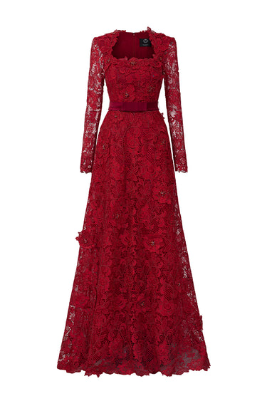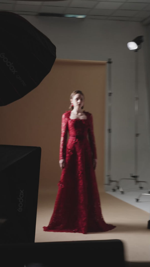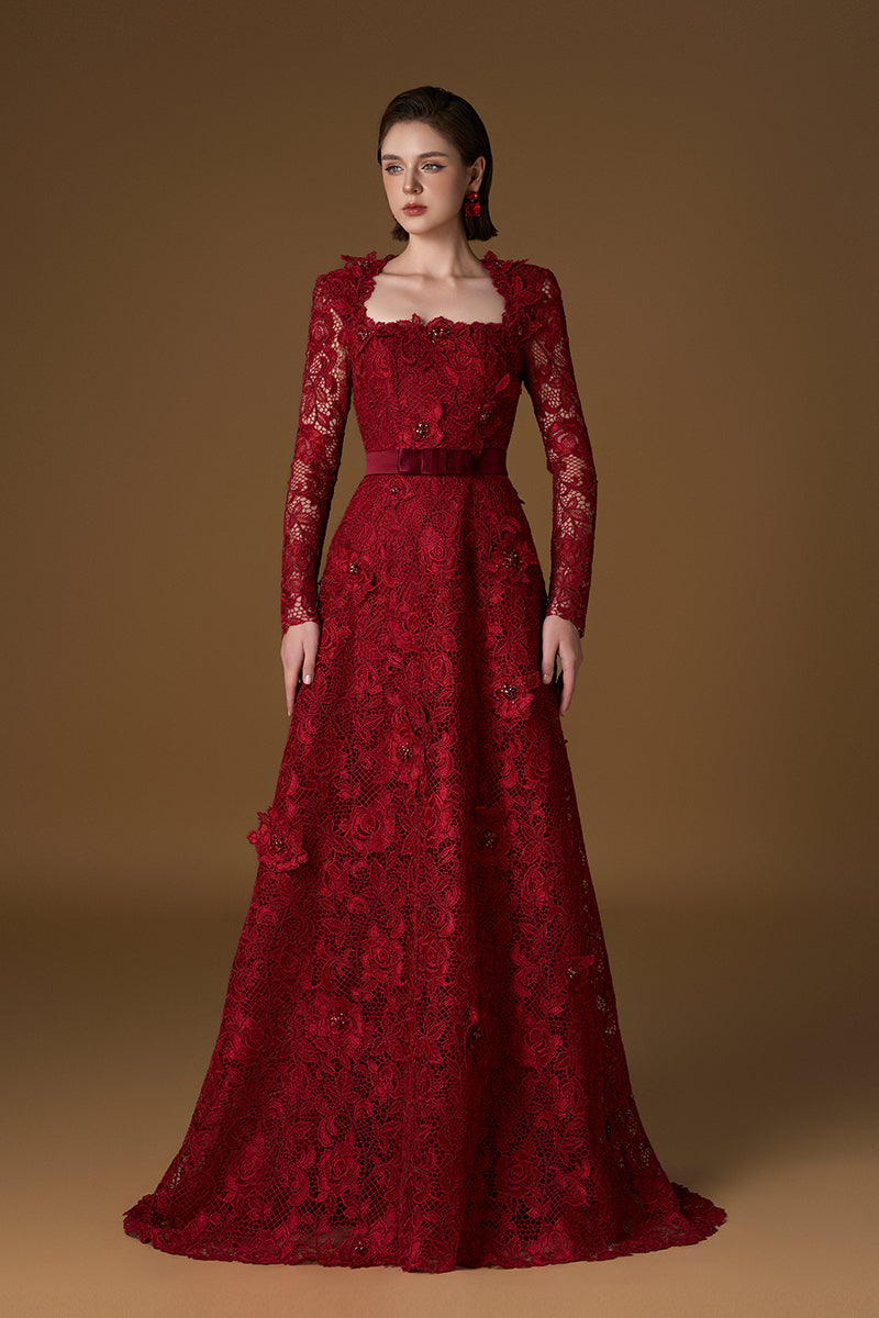 فستان A-line من الدانتيل والحرير المُطرز بالجبر يُضفي فخامةً هادئةً وأناقةً خالدةً. يُضفي خط العنق شبه المنحرف والأكمام الطويلة لمسةً كلاسيكيةً راقية، بينما يتألق الدانتيل الزهري ثلاثي الأبعاد المُزخرف يدويًا ببريقٍ رقيق. يُحيط حزامٌ حريريٌّ لامعٌ بالخصر، مُكملاً تصميمًا يُجسّد الرقيّ والشغف والجاذبية الأنثوية.