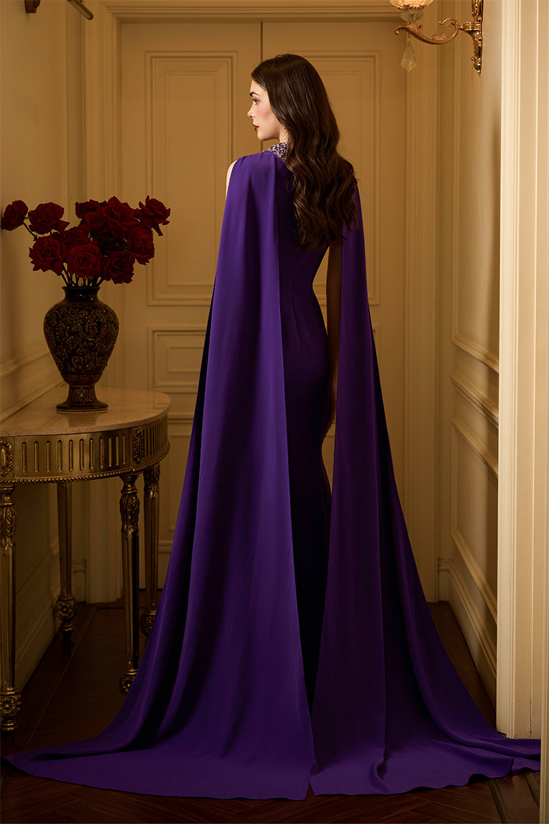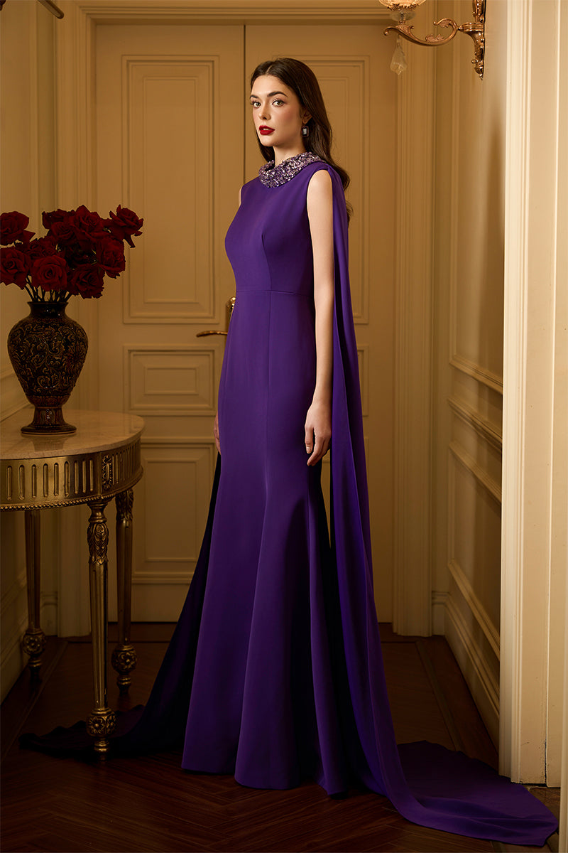 هذا الفستان بقصة حورية البحر بدون أكمام، مصنوع من قماش الكريب الفاخر، يجمع بين الأناقة والرقيّ الجريء. قماشه المرن قليلاً يناسب الجسم في تصميم حورية البحر الأخّاذ، مُبرزاً منحنيات الجسم برشاقة. يتميّز رقبة الفستان المستديرة بياقة مُفككة، مُزينة بالكامل بأحجار مُختلطة، مُضيفةً لمسةً من الفخامة والتفاصيل الدقيقة. ينسدل ذيل الفستان الطويل من الكتف، مُضفياً لمسةً ساحرةً وهو يتدلى خلفه. يُجسّد هذا الفستان سحراً عصرياً بجاذبية خالدة، مما يجعله الخيار الأمثل لأمسية لا تُنسى.