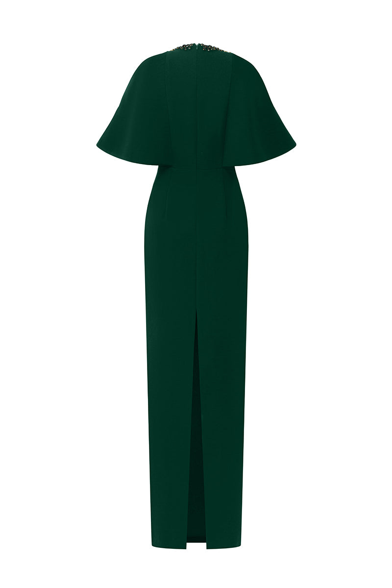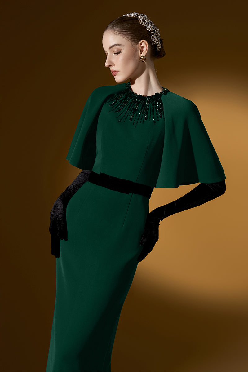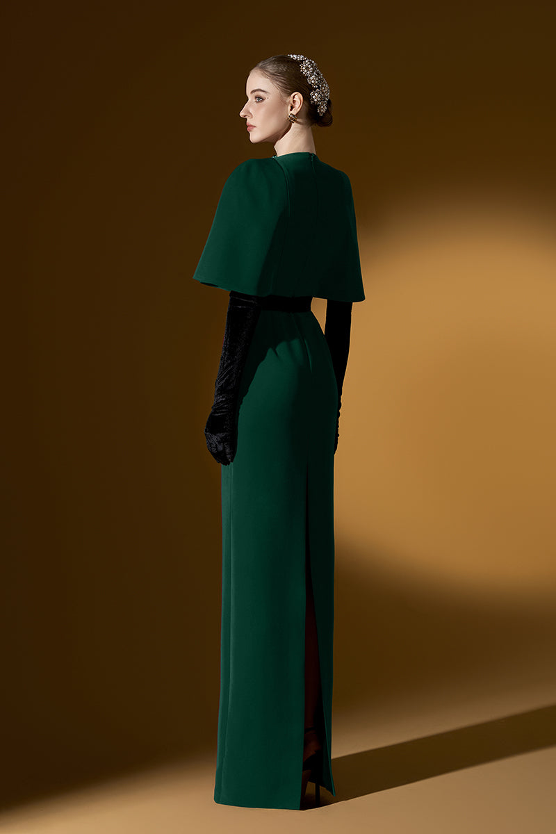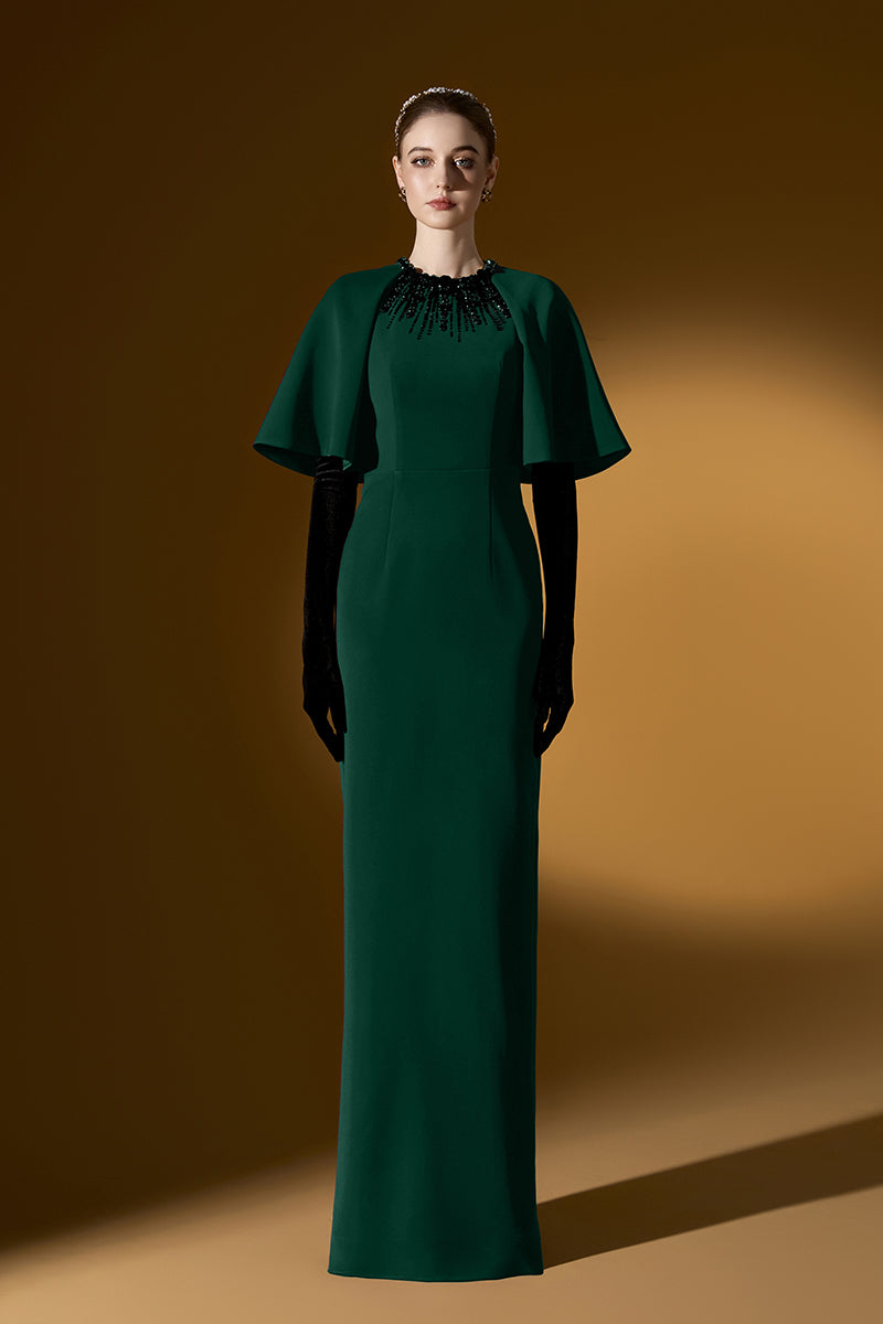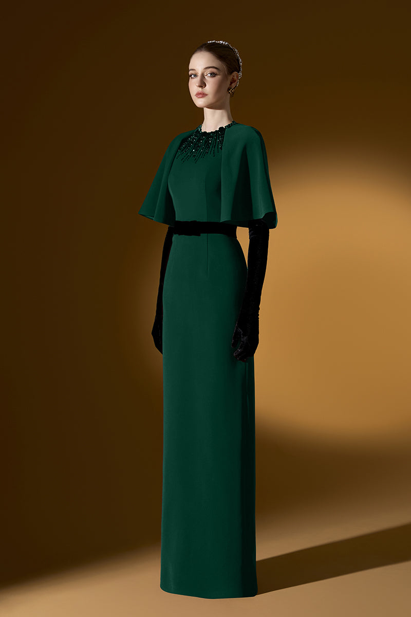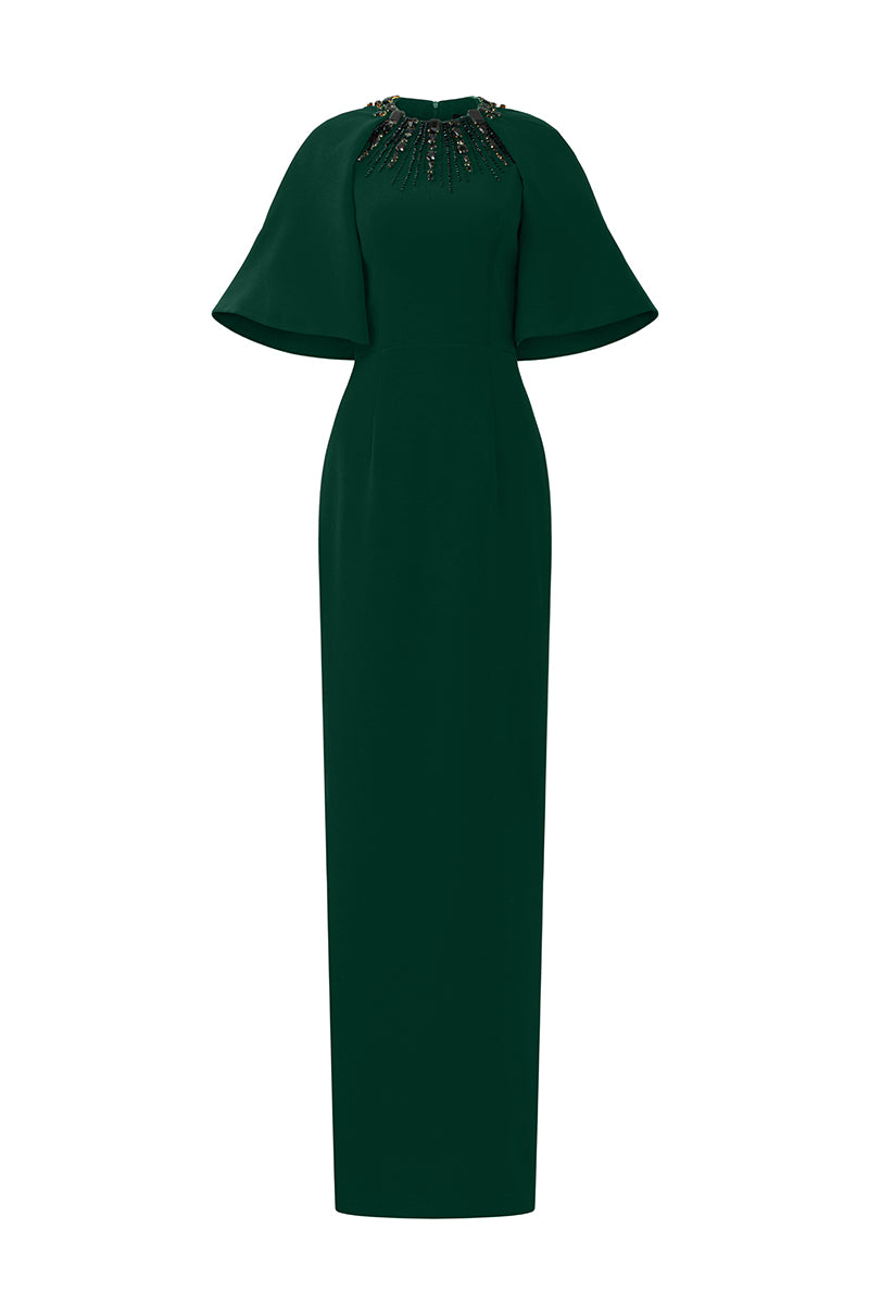 يجمع هذا الفستان الطويل ذو الرقبة المستديرة والعمودية بين الجرأة الجريئة والأناقة الراقية. تضفي أكمام الراجلان المبالغ فيها لمسةً آسرة، بينما تتدفق الكريستالات برقة من خط العنق، مما يُضفي بريقًا آسرًا. مصنوع من قماش الكريب الفاخر، ينساب الفستان برشاقة، ليضفي لمسةً من الرقي والسحر العصري. مثالي لمن تبحث عن إطلالة لا تُنسى، حيث ينضح هذا التصميم بالرقي والجرأة.