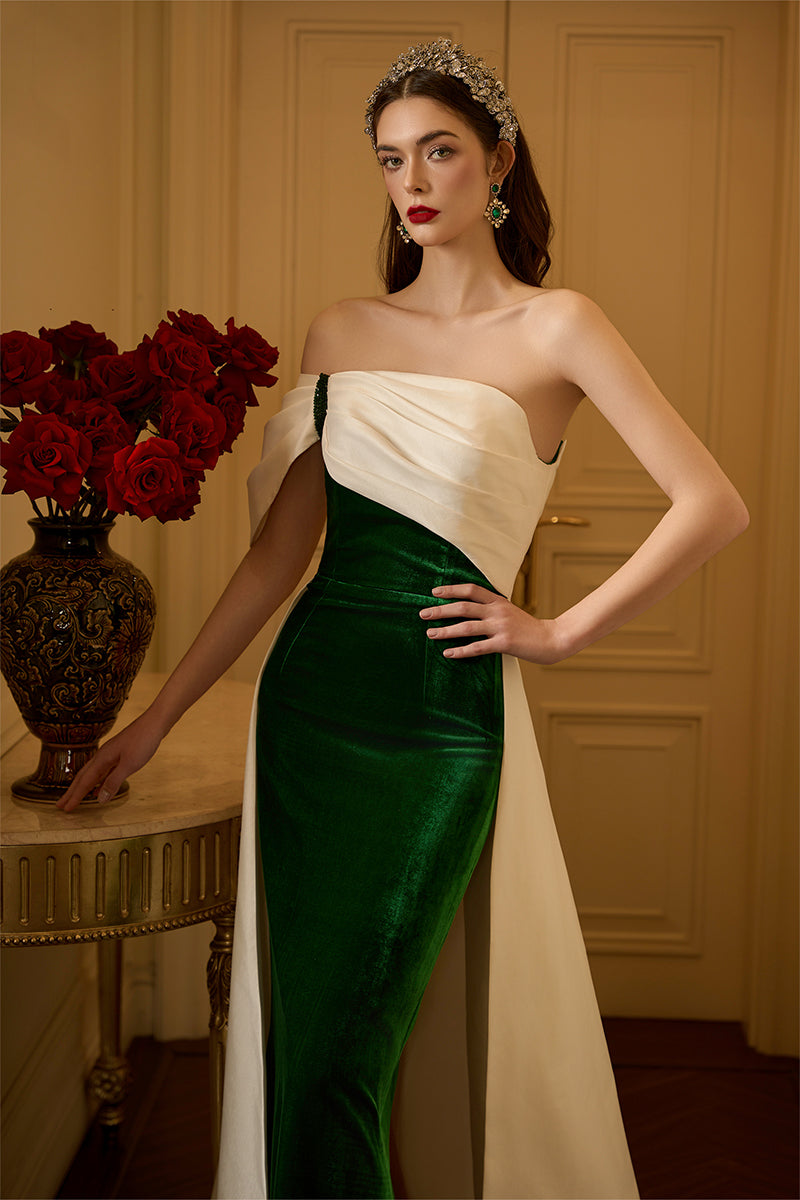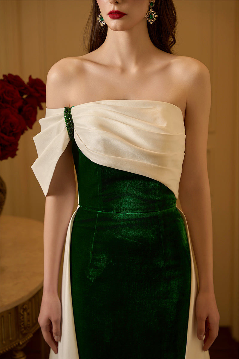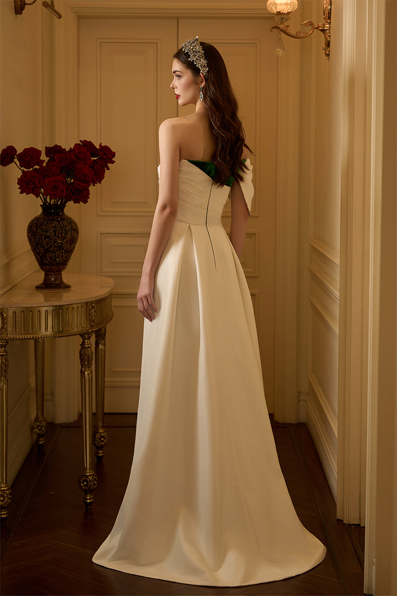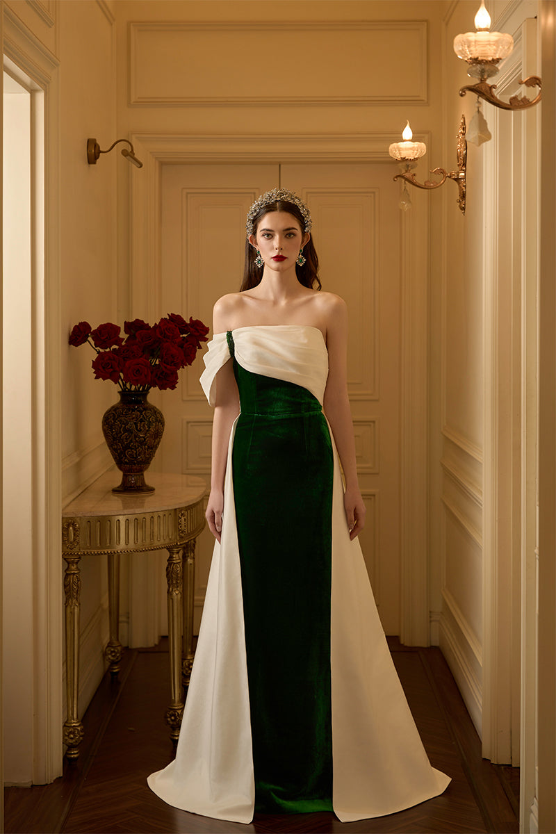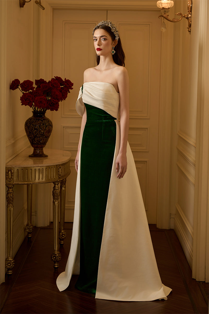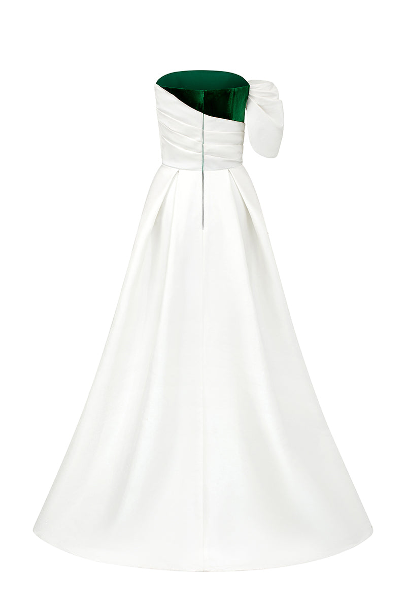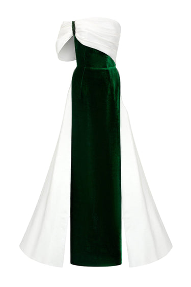 هذا الفستان الطويل ذو الصدر العمودي، المصنوع من المخمل الحريري والتفتا، يجمع بين الفخامة والأناقة. يكتمل تصميمه بدون حمالات بأكمام غير متماثلة مكشوفة الكتفين، مما يمنحه مظهرًا عصريًا لافتًا. ينساب الجزء العلوي المنسدل برشاقة على ذيل الفستان، مما يضفي عليه لمسة من الرقي والانسيابية. يُضفي التباين الجريء بين التفتا الأبيض والمخمل الأخضر الغني لمسةً ساحرة، بينما تُزيّن الكريستالات تفاصيل الأكمام والكتفين برقة، مما يضفي على الفستان لمسةً من الفخامة. يُعد هذا الفستان تجسيدًا مثاليًا للتألق الخالد والسحر الراقي، مثاليًا لأي أمسية لا تُنسى.