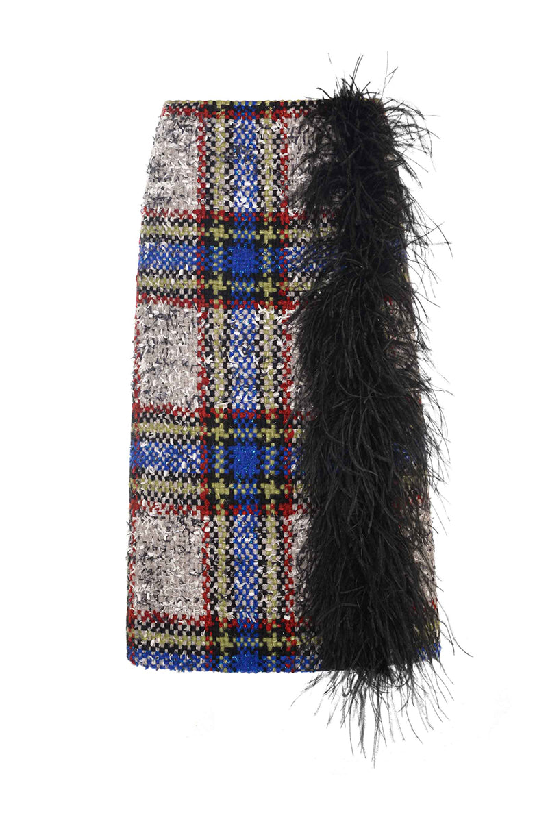 تنورة من الصوف والريش بمربعات باللون البيج والأزرق