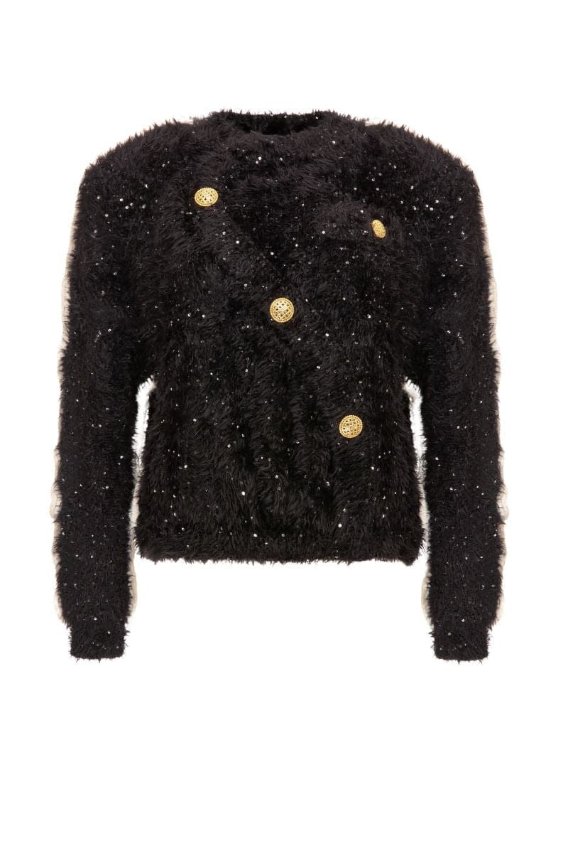 سترة سوداء منفوشة بأزرار ذهبية