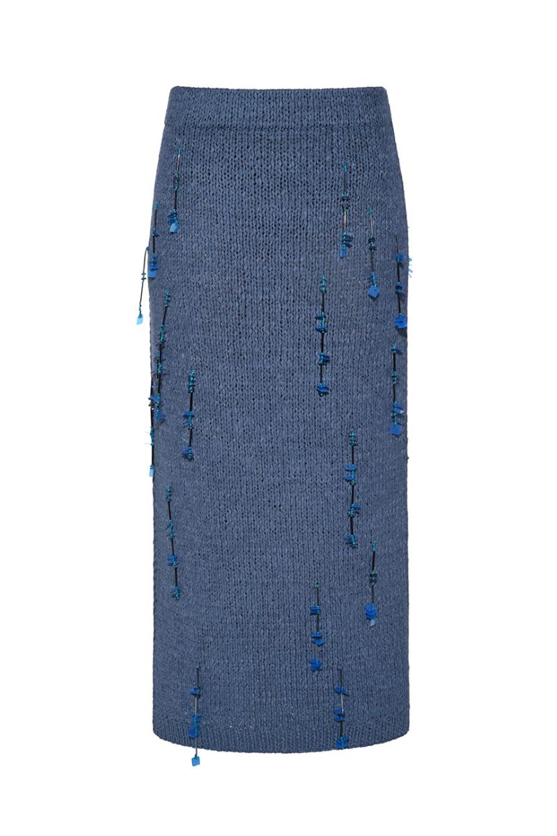 تنورة قلم رصاص محبوكة يدوياً مزينة باللون الأزرق