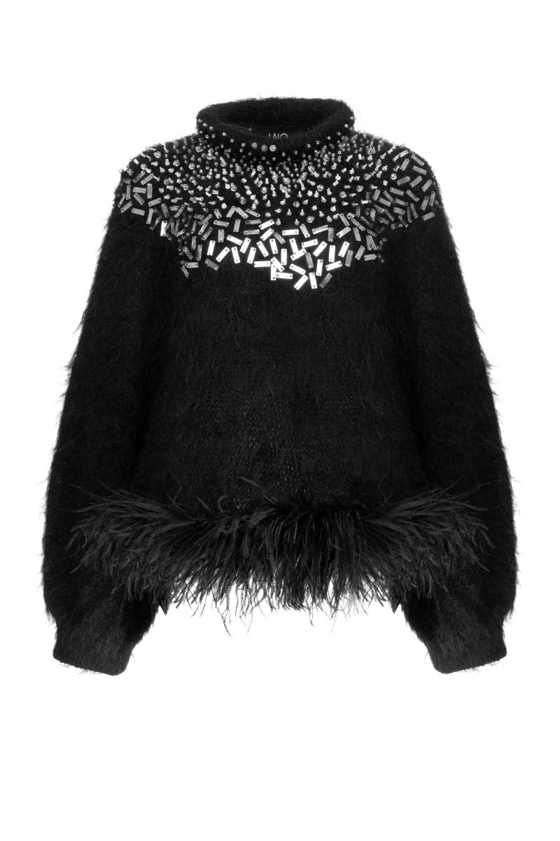 ارفعي أناقتك مع هذه السترة السوداء، التي تتميز بمظهر فريد من نوعه من الأمام وريش رقيق يزين الجزء السفلي. بفضل أكمامها الطويلة وياقة الياقة المدورة الرقيقة، تم تصميم هذه القطعة الفاخرة لأولئك الذين يتوقون إلى الرقي. إن التفاعل بين الأنسجة المتباينة، بدءًا من اللمسات النهائية الشبيهة بالمرآة وحتى تفاصيل الريش، يضفي انطباعًا جريئًا يجذب الانتباه.