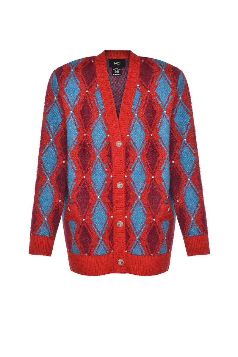 كارديجان من الصوف منقوش باللونين الأحمر والأزرق