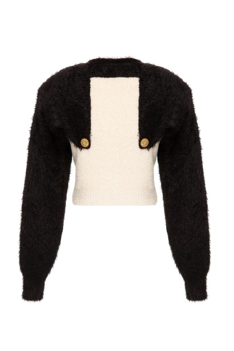 سترة فريدة من نوعها باللونين الأبيض والأسود مع أكتاف منظمة وأكمام سوداء طويلة منفوشة مزينة بأزرار ذهبية أنيقة. تحاكي هذه القطعة الأنيقة مظهر الجزء العلوي، مما يوفر إضافة مميزة لخزانة ملابسك. التصميم الكلاسيكي باللونين الأبيض والأسود، إلى جانب اللمسات الذهبية الفاخرة، يخلق مظهرًا راقيًا وخالدًا. هذه السترة يجب اقتناؤها لعشاق الموضة، فهي تضفي الأناقة والأناقة دون عناء.