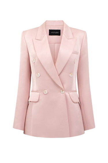 سترة كبيرة الحجم من التفتا باللون الوردي مع تصميم منظم وأكتاف عريضة، تتميز بتفاصيل بسيطة ونظيفة لإطلالة عصرية أنيقة.