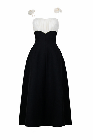 مميزات خاصة: تباين بين اللونين، وردة ثلاثية الأبعاد مثبتة على الكتف، صدر مجعد