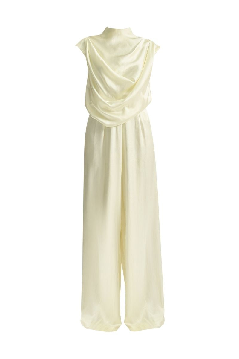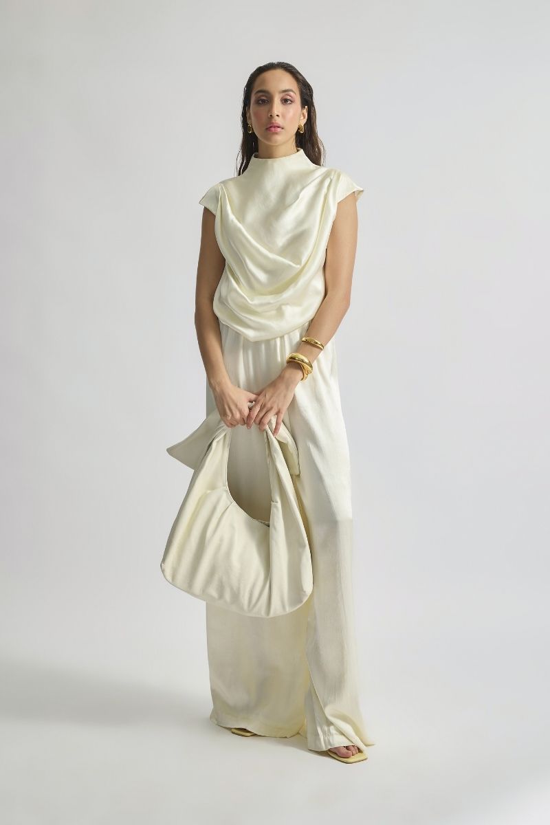 طقم أنيق من الساتان يتميز بجزء علوي منثني وأكمام على شكل كاب، ورقبة عالية، مع بنطال ساتان مطابق لأناقة سهلة.