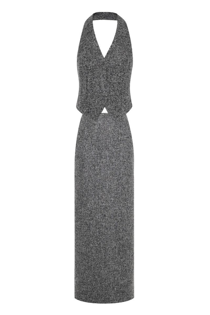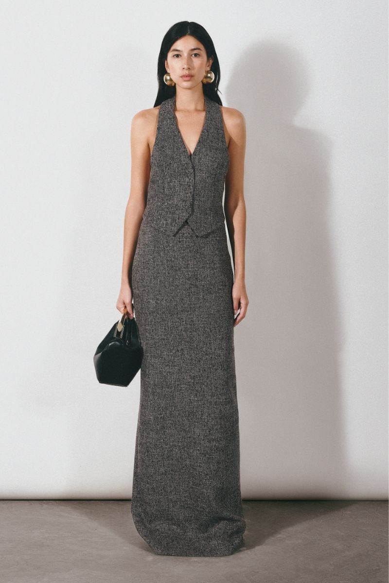مصنوع من قماش التويد الفاخر، هذا الطقم الأنيق المكون من قطعتين يتميز بياقة رسن وفتحة خلفية لإضفاء لمسة راقية. مع تصميم التنورة بطول الأرض، فهي تعكس التفرد والرقي لقطعة أزياء راقية.