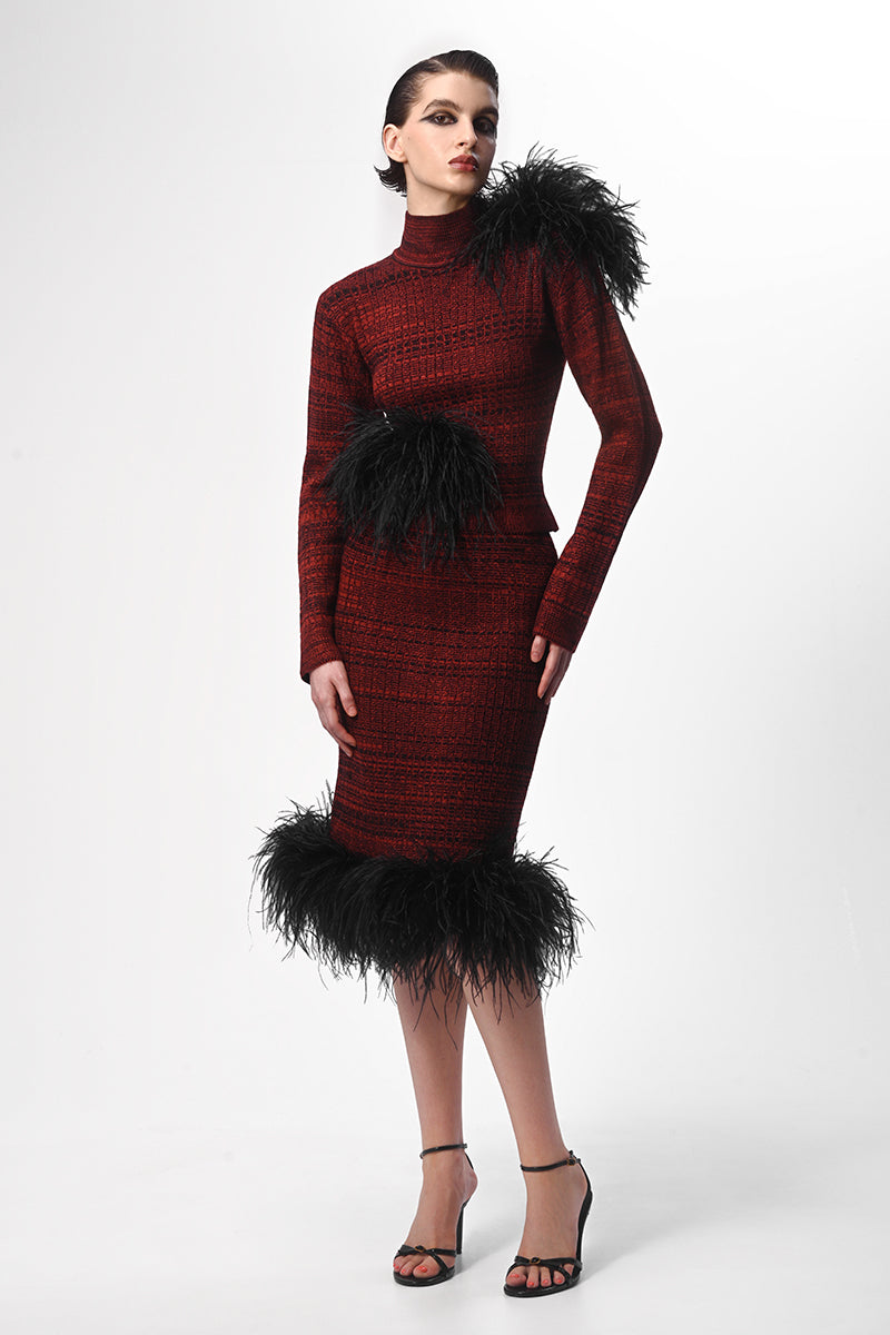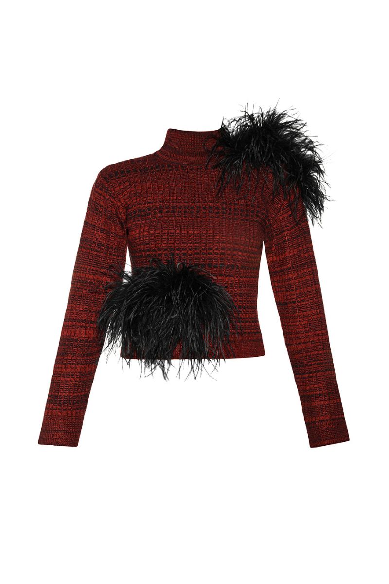 بلوزة بياقة عالية مزينة بتفاصيل من الريش متعدد الألوان