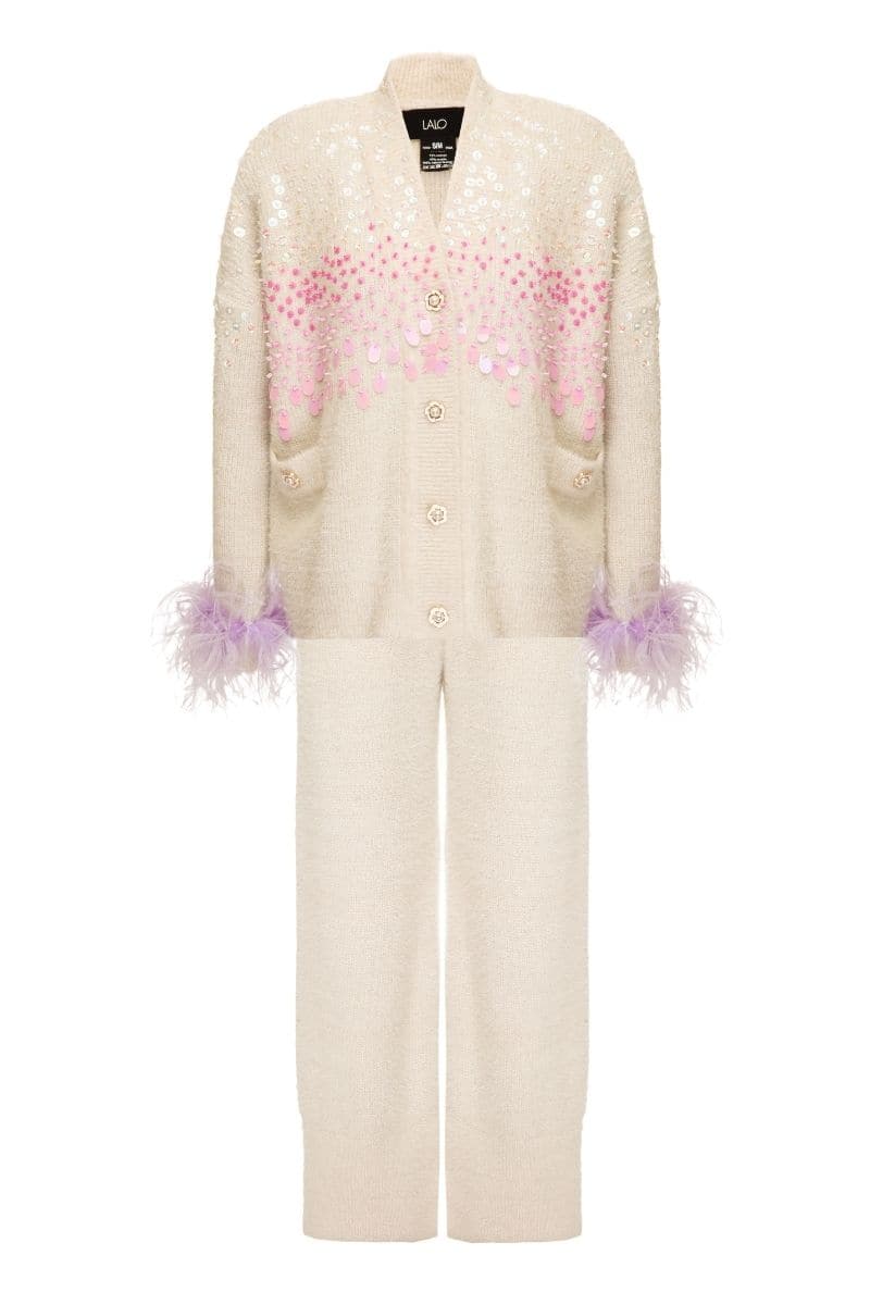 طقم كريمي محبوك بأساور من الريش