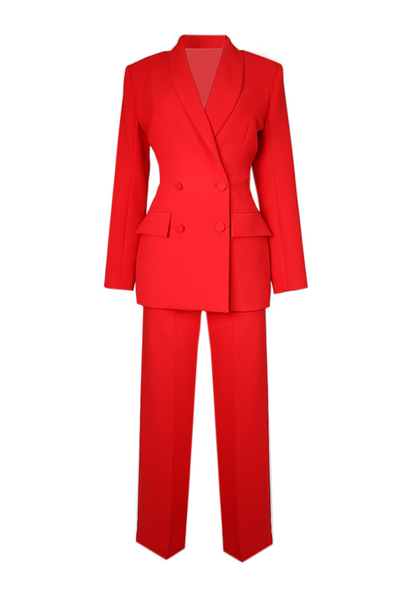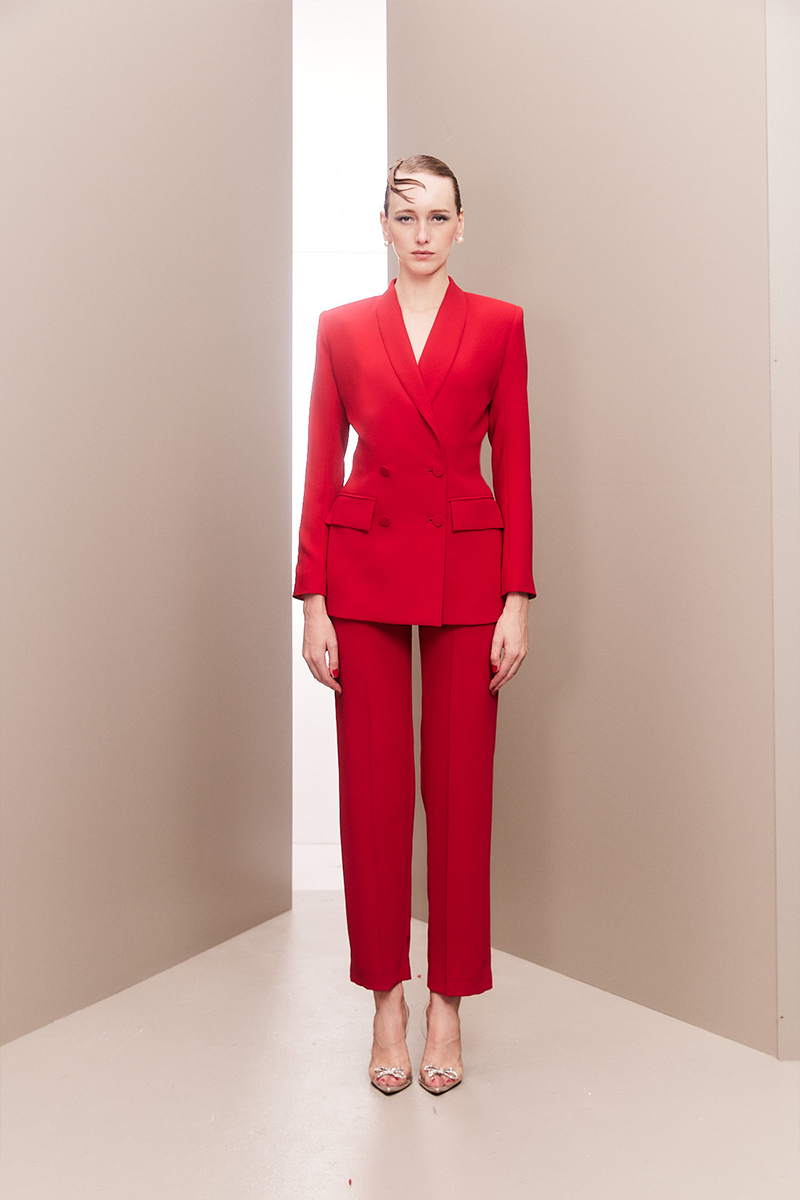 تُجسّد بدلة الساعة الرملية الحمراء قمة الأناقة العصرية بسترتها الحمراء المُصمّمة على شكل الساعة الرملية، بتفاصيلها الدقيقة التي تُضفي لمسة جمالية مميزة. تُزيّن هذه السترة بأربعة أزرار أمامية أنيقة وياقة كلاسيكية تُزيّن الياقة، وتلفت الأنظار بتصميمها المُصمّم على شكل الساعة الرملية لإبراز قوام من ترتديها. تُضفي هذه المجموعة، المُكمّلة بأكمام طويلة ووسادات أكتاف رقيقة، لمسةً من الثقة والأناقة.