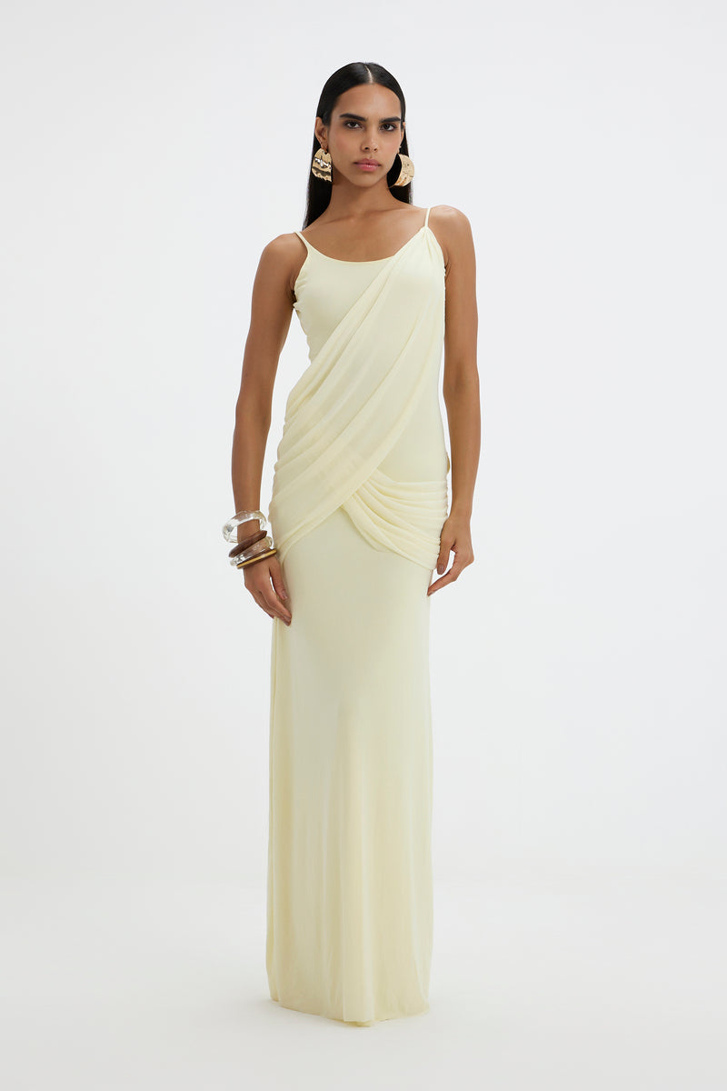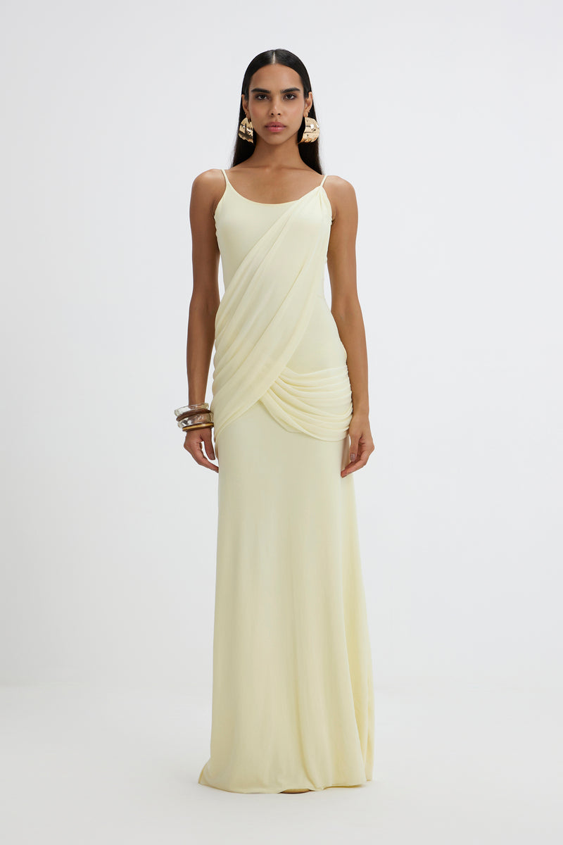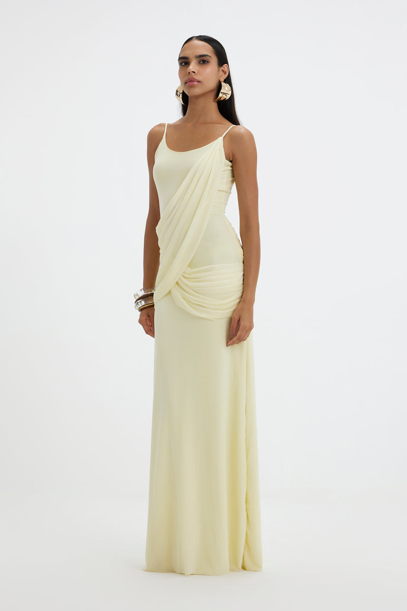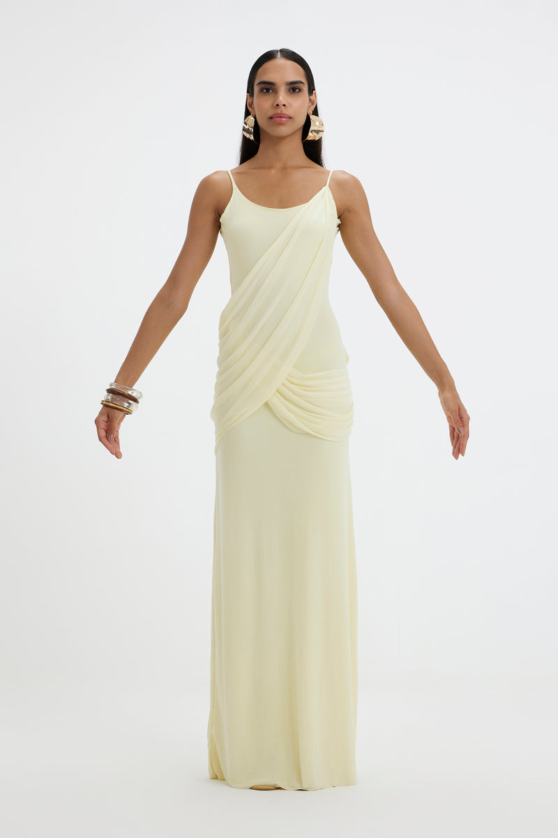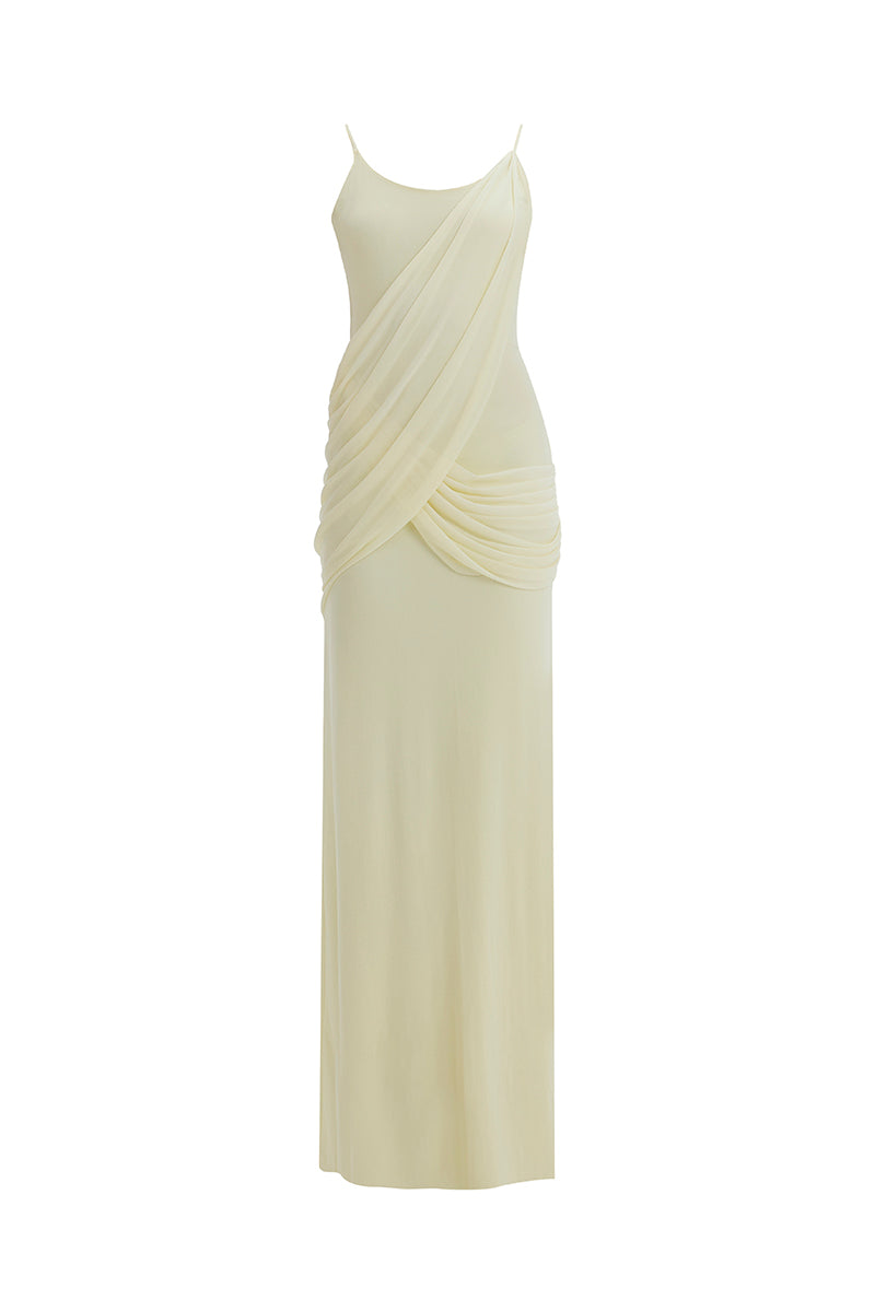 - يتميز هذا الفستان الأملس المصنوع من قماش الملاي المطاطي بقصة واسعة من الأسفل، بينما تلتف طبقات من قماش التول الشفاف حول الجسم برشاقة، مما يضيف طبقات من الحركة.