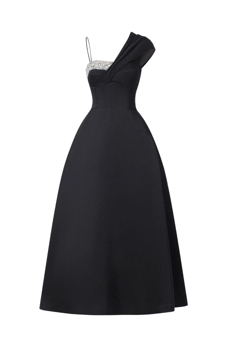 فستان متوسط الطول غير متماثل مطرز بالكريستال بكتف واحد