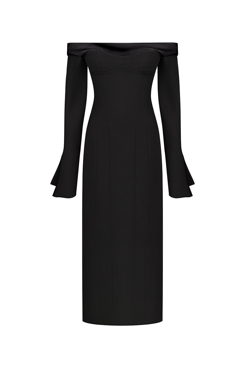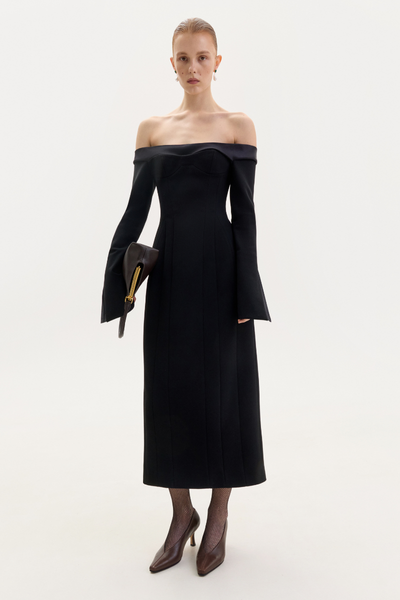 فستان أسود متوسط الطول من الصوف مكشوف الكتفين