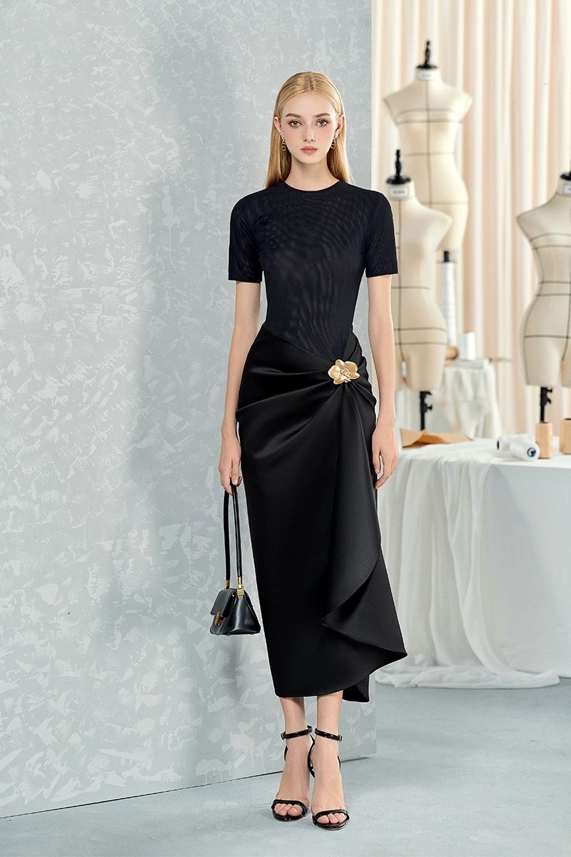 فستان باللون الأسود العصري مع تصميم حديث ومميز. يتكون الفستان من بلوزة من القماش الشبكي القابل للتمدد وتنورة من الحرير الفاخر بتصميم درابيه مُتقن. أما لمسة الجمال الأخيرة، فتأتي من زهرة الأوركيد التي تزين أعلى الجانب.