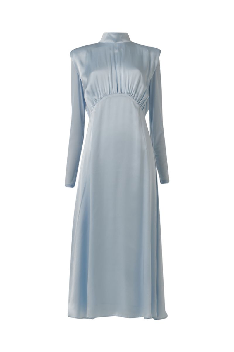 هذا الفستان الحريري ذو الياقة العالية يُجسّد لمسةً هادئة. أكمامه الشبكية الشفافة وياقته العالية تُضفيان تباينًا وجاذبية، بينما يُضفي الخصر المُكدّس شكلًا أنيقًا. كل تفصيلة فيه تبدو مُصمّمة بعناية - ناعمة، انسيابية، وجذابة. إنه الفستان المثالي للأمسيات التي تتطلب رقيًا وفخامة.
