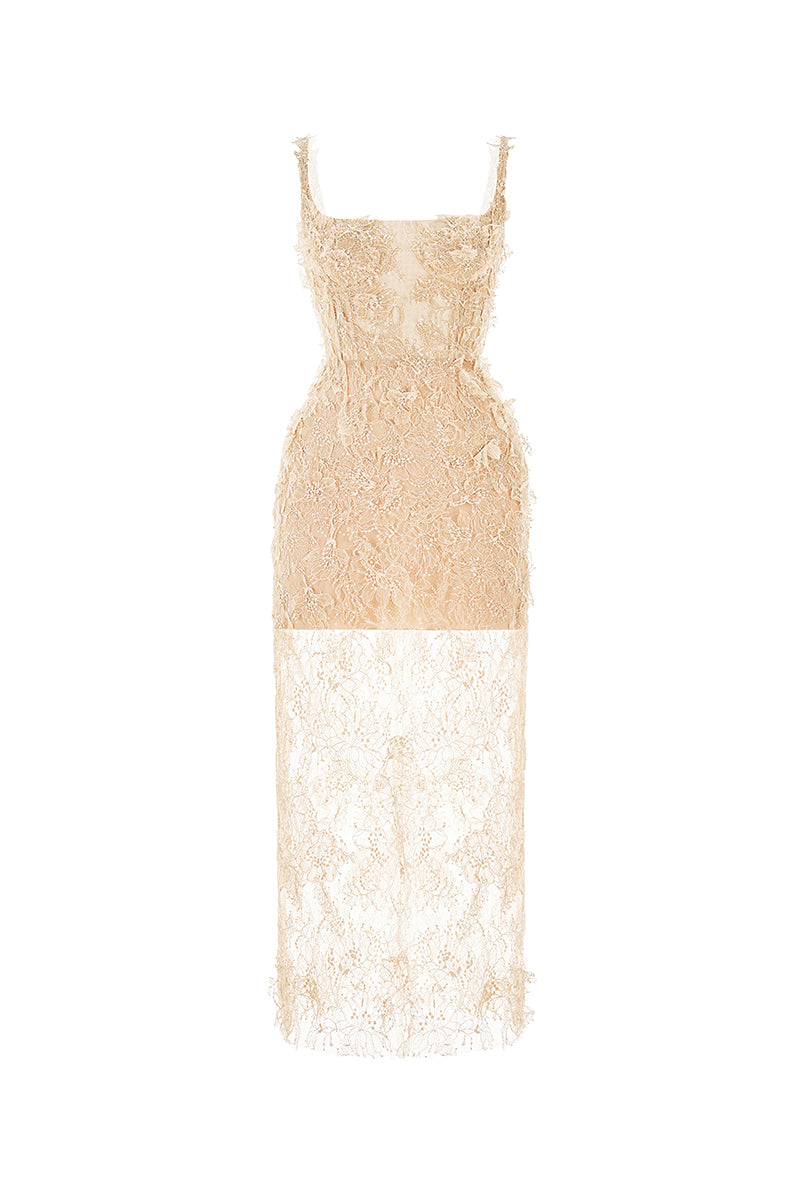 فستان رصاص من الدانتيل مطرز باللون العاجي