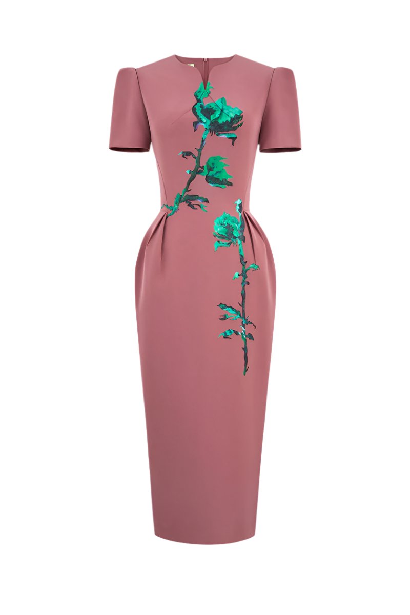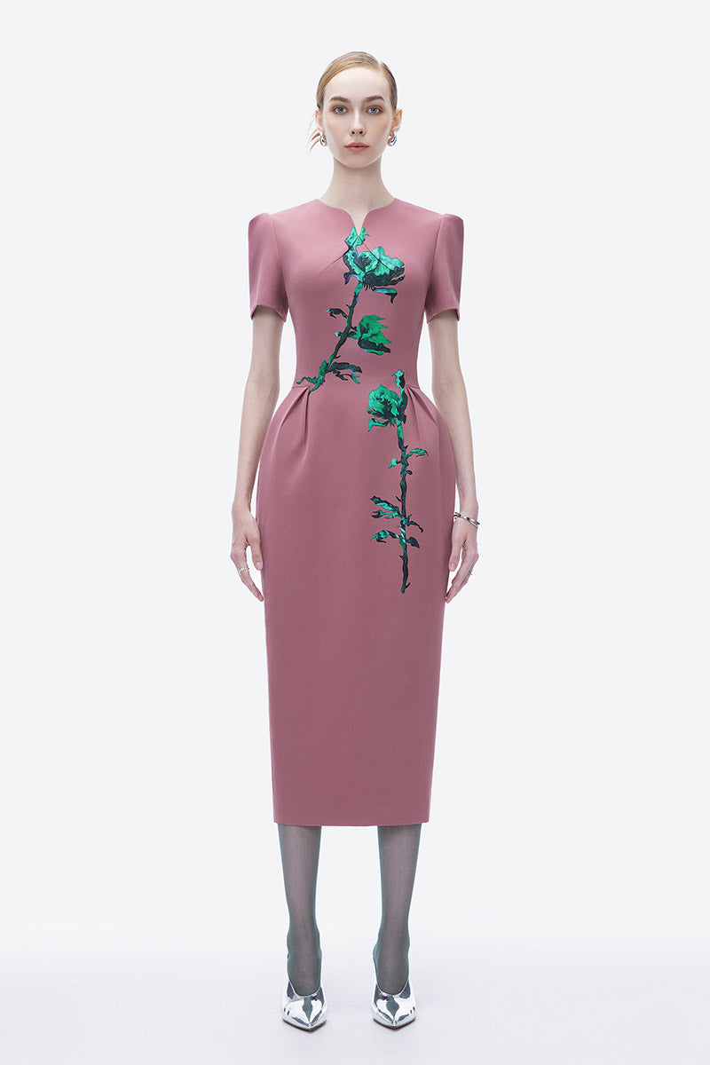 أناقة غامضة - صُمم هذا الفستان متوسط ​​الطول باهتمام شديد بالتفاصيل، ويتميز بزخارف نباتية مجردة مرسومة يدويًا تثير شعورًا بالرقي الخيالي. تبرز الأزهار الخضراء النابضة بالحياة، التي تتفتح بأناقة زاهية، بشكل جميل على خلفية وردية ناعمة، مما يخلق جوًا من الغموض المكرر.