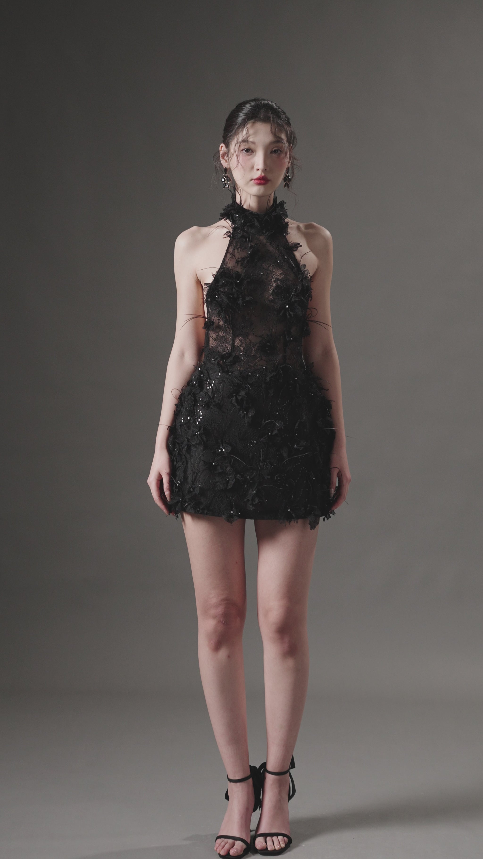 - فستان هالتر من الدانتيل الشفاف مع صورة ظلية منحوتة