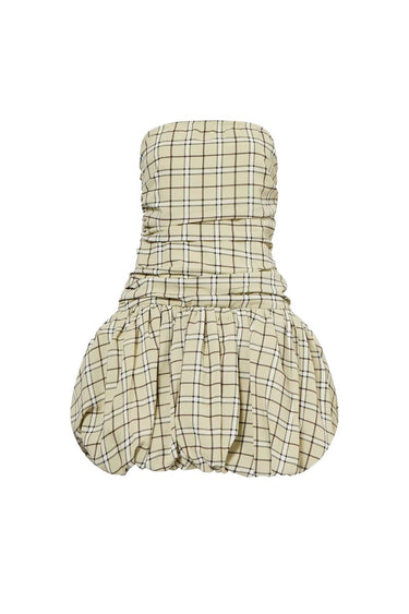 - فستان قصير للغاية بدون حمالات مع رباط ذاتي على الكتف وخصر منخفض