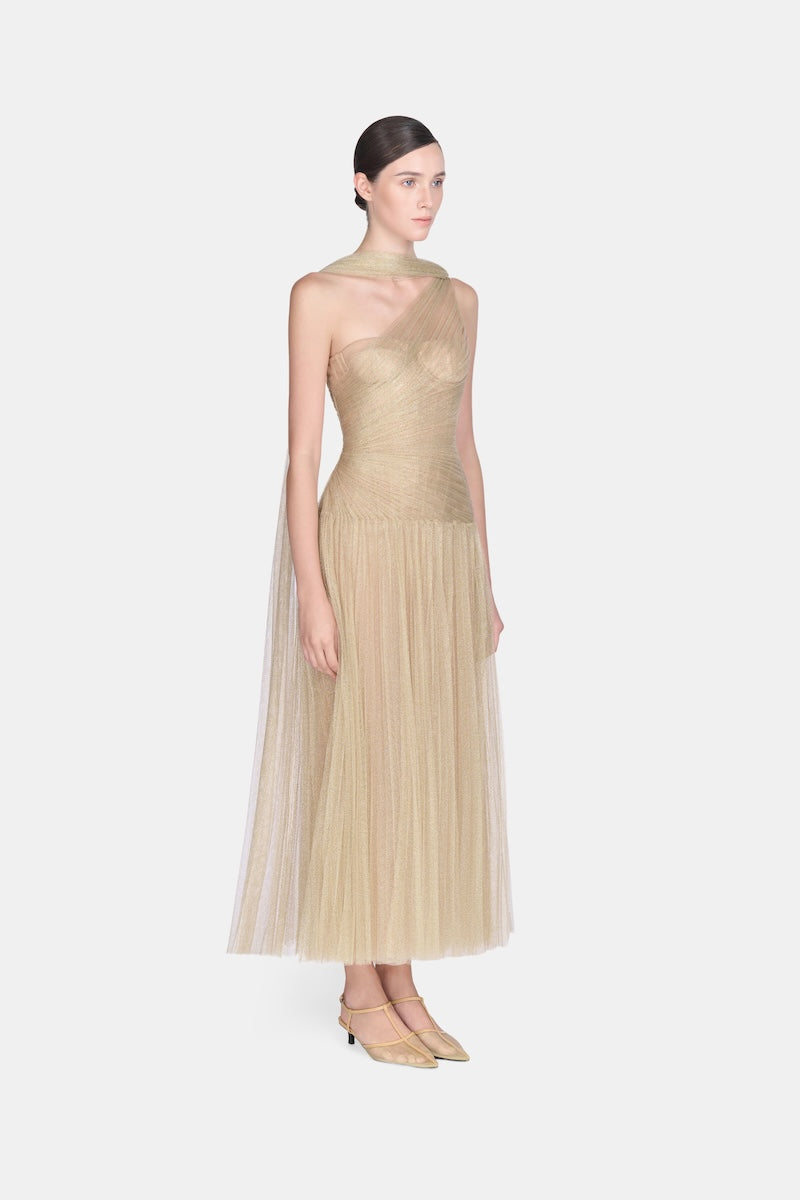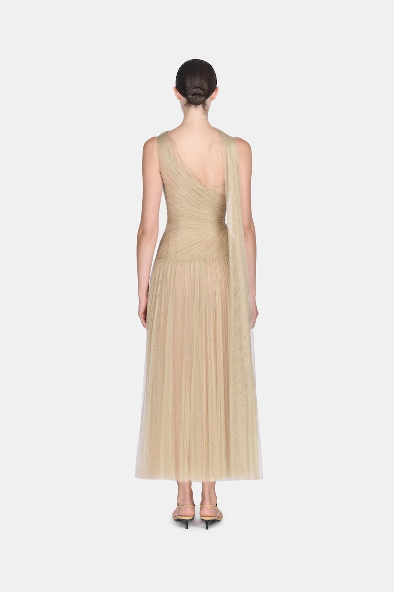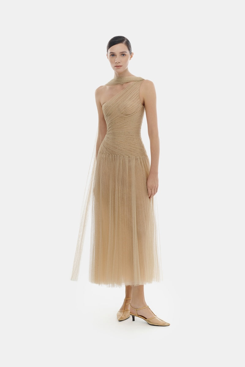 فستان ميدي ذهبي اللون بتصميم منسدل