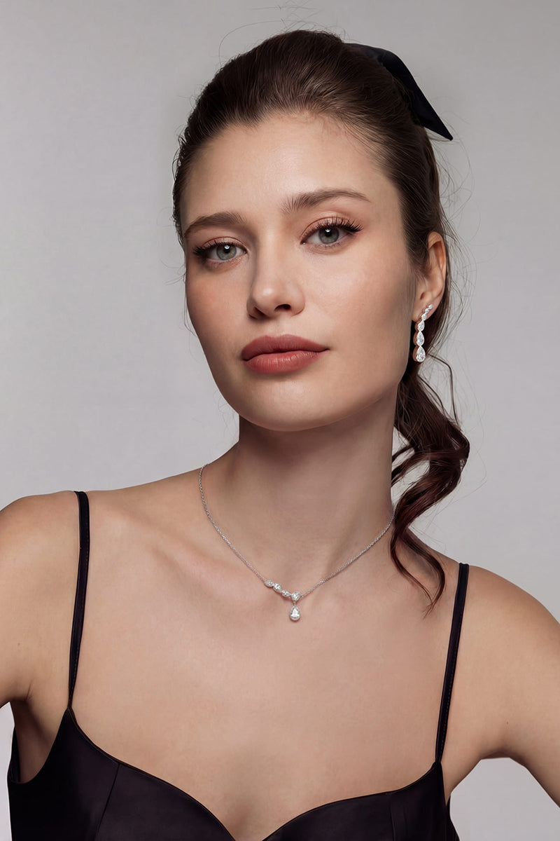 - التصميم: قلادة فضية مع قلادة من الزركونيا المكعبة على شكل قطرة ماء على شكل كمثرى