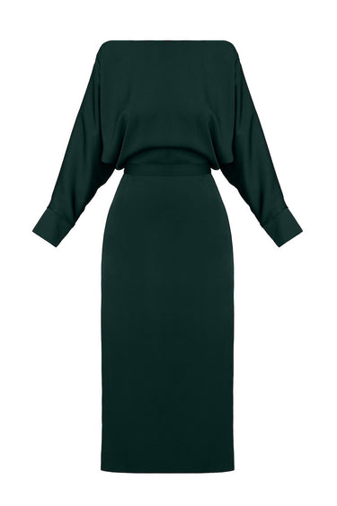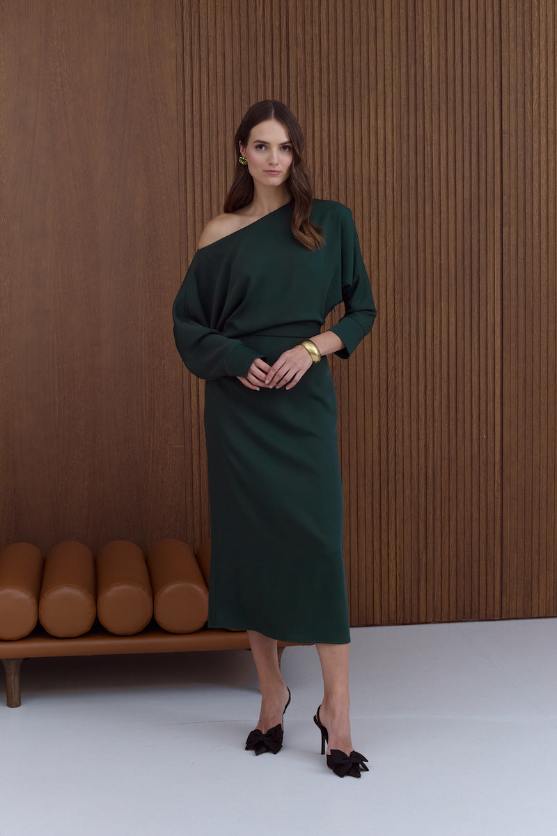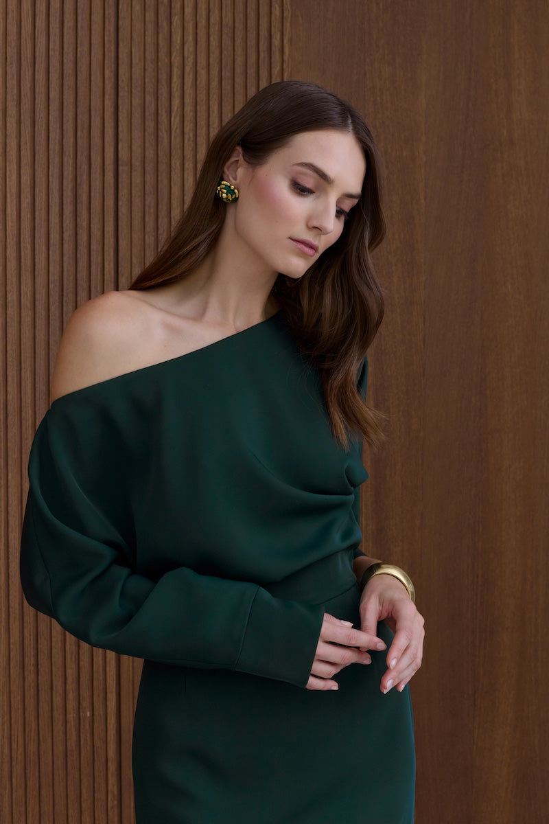 امتلكي قصتكِ الخاصة. تألقي بالأناقة. ارتدي فستان أغاليا الأخضر الداكن مكشوف الكتفين متوسط الطول - حيث تُضفي كل حركة لمسةً من الهدوء والسكينة.