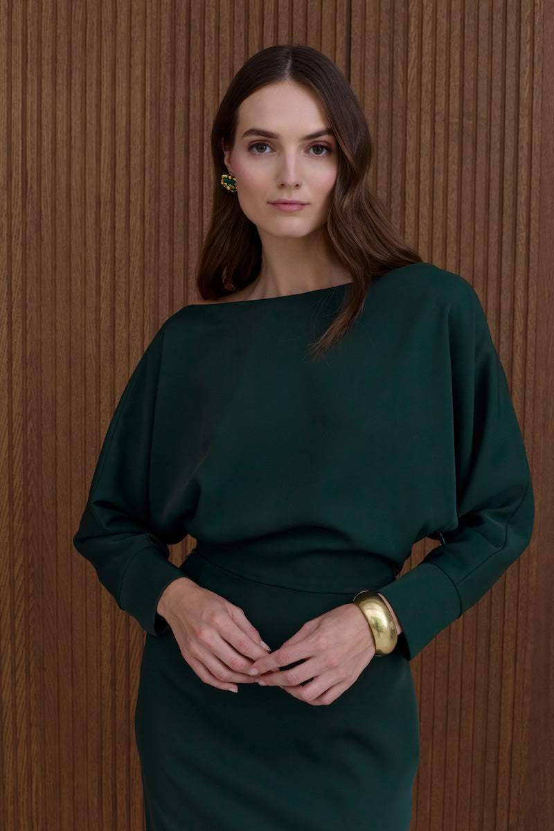 نقدم لكم فستان أغاليا ميدي الأخضر الداكن المكشوف الكتفين - حيث تلتقي القوة الهادئة بالأنوثة الراقية في تصميم يأسر الألباب. بفضل رقبته المكشوفة الكتفين وحزام الخصر المنسدل بنعومة، يُضفي أغاليا لمسة أنيقة تجمع بين الثقة والسحر العفوي.