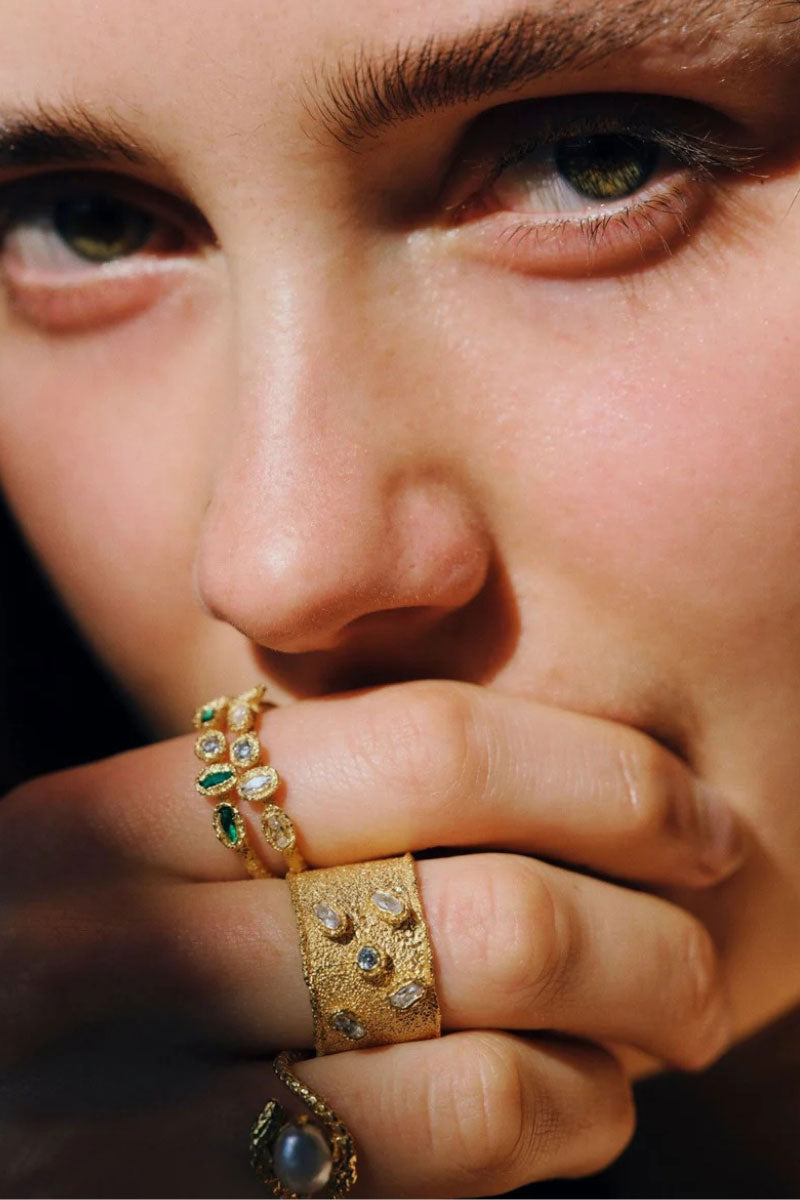 صُممت هذه القطعة بدقة متناهية لتعكس ألوان أضواء الشفق القطبي المتألقة واحتفاءً بجمال هذه الظاهرة الطبيعية، وهي مصنوعة من الفضة المطلية بذهب عيار 24 قيراطًا. وتزدان بكريستالات سواروفسكي المرصعة بتقنية الرصف، وتتميز بمقاس واحد قابل للتعديل.
