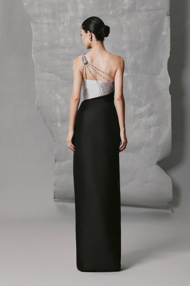 فستان غير متماثل بكتف واحد، مصنوع من قماش التفتا الفاخر باللونين الرمادي الفضي والأسود، يتميز بتصميم أنيق وضيق مع شق عالٍ أنيق. تُضفي تفاصيل الكتف المزينة بالكريستال لمسة راقية، بينما تضمن البطانة الحريرية الناعمة راحةً وانسيابيةً أنيقةً أثناء الحركة.