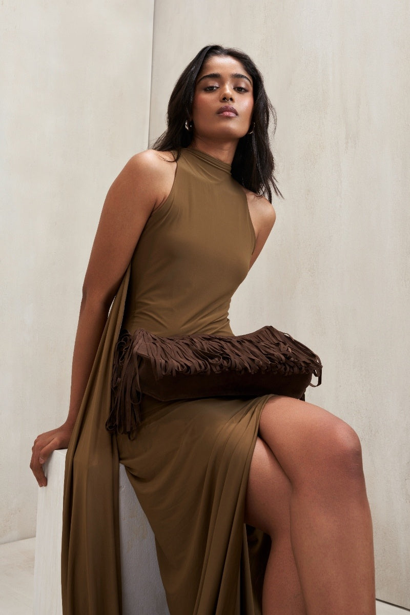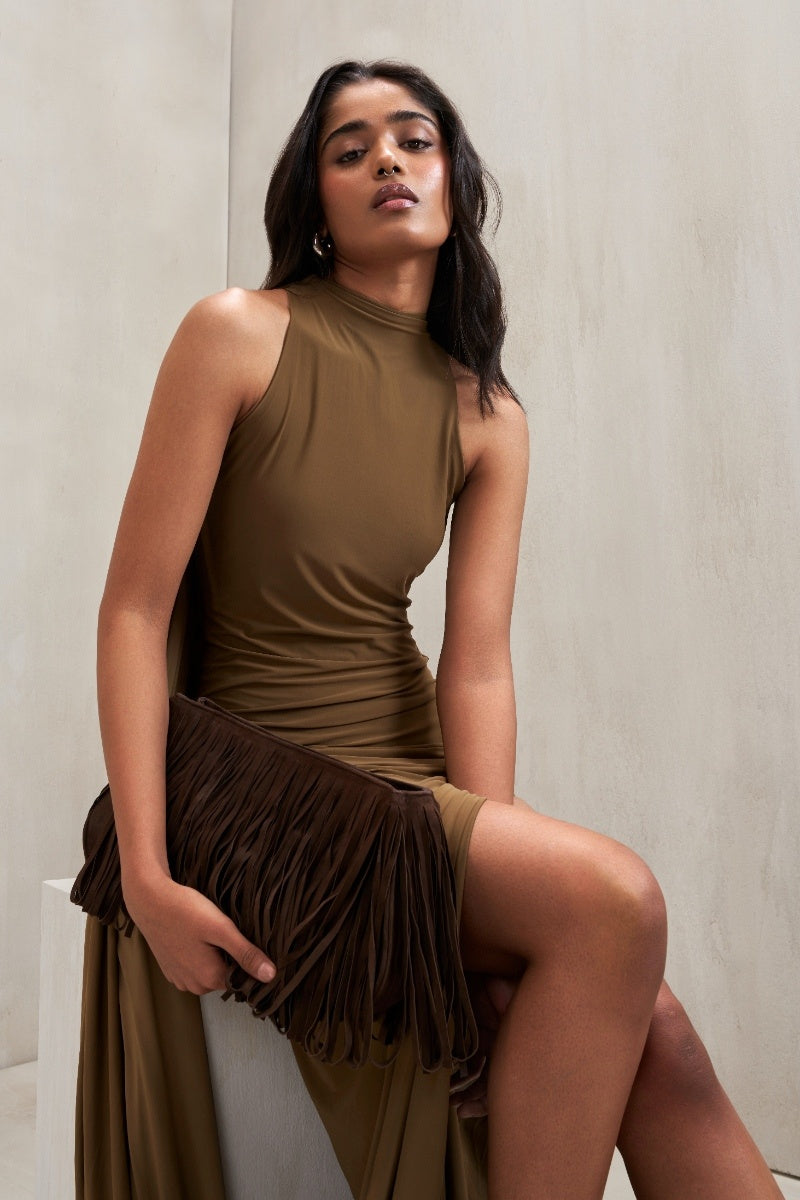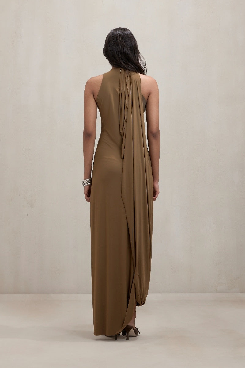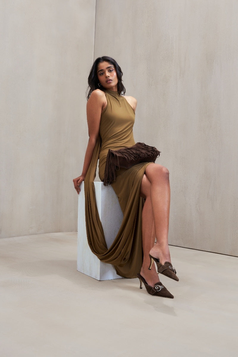 فستان ماكسي هالتر بتصميم طويل يصل إلى الأرض، يتميز بياقة عالية أنيقة وشق جانبي جريء. حاشية الفستان مجمعة في شكل ثنية ناعمة منحوتة تُضفي لمسة منتفخة رقيقة عند الكاحل.