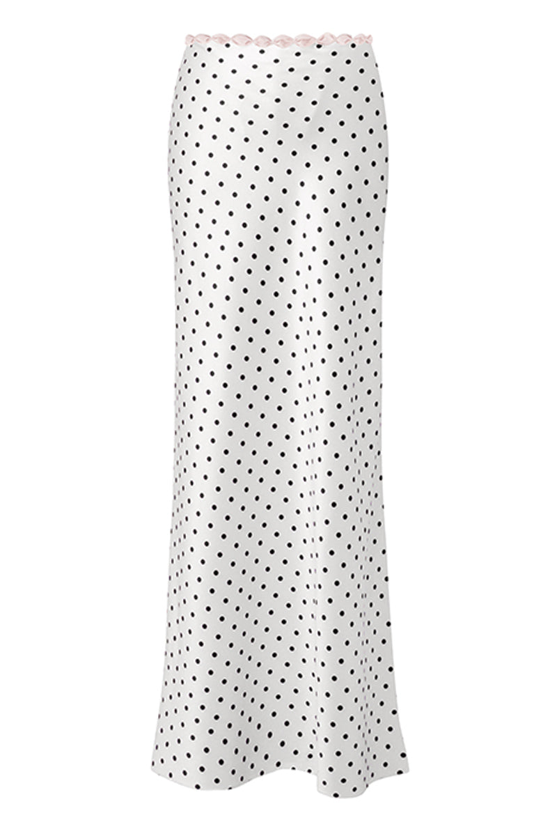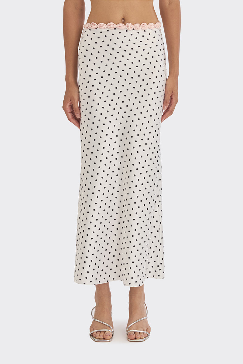 مصممة بإتقان. هذه التنورة الماكسي المنقطة مزينة بكشكشة "كريمة الكيك" المصنوعة يدويًا من الساتان، وهي من تصميمنا الخاص، عند الخصر. قصتها مائلة لتمنحكِ إطلالة انسيابية وناعمة، وهي قطعة مثالية لتنسيقها مع مشدّ أو حمالة صدر "كيك".