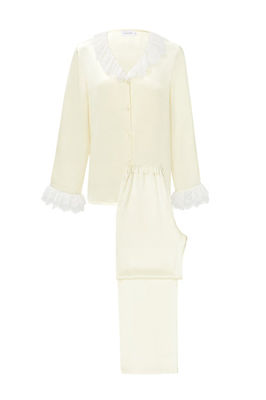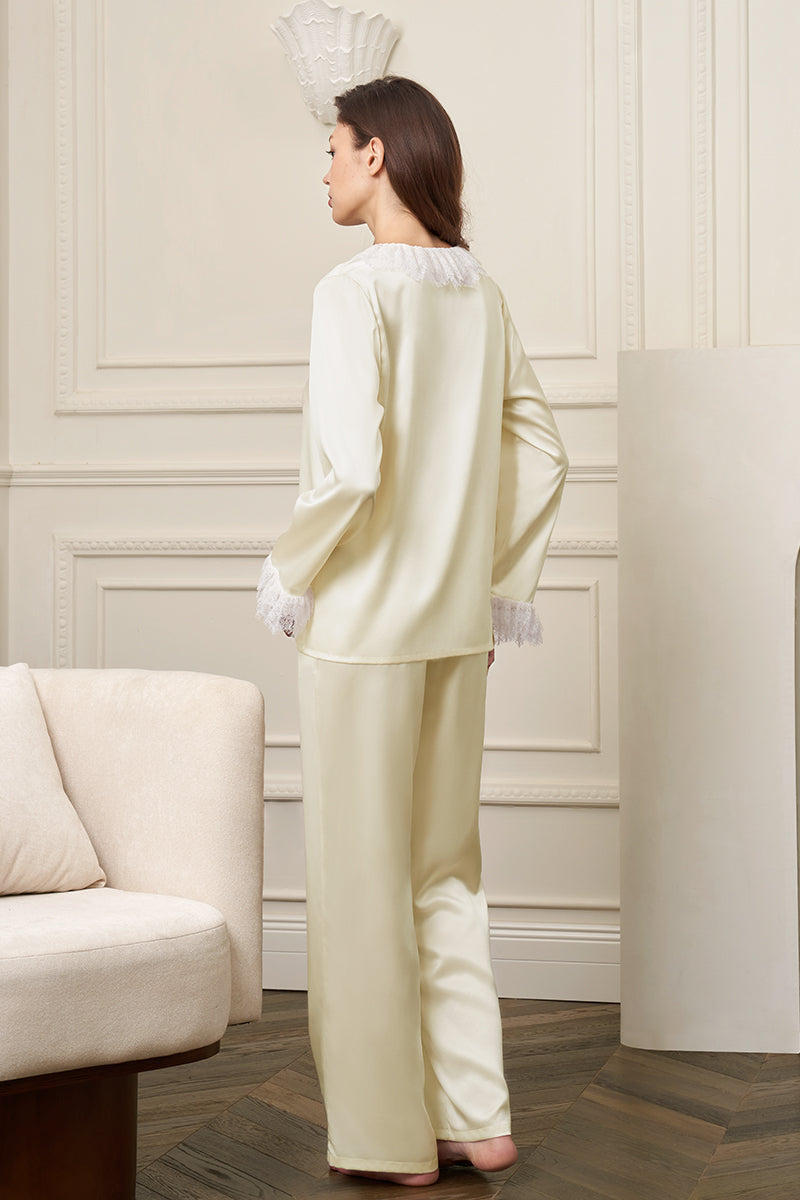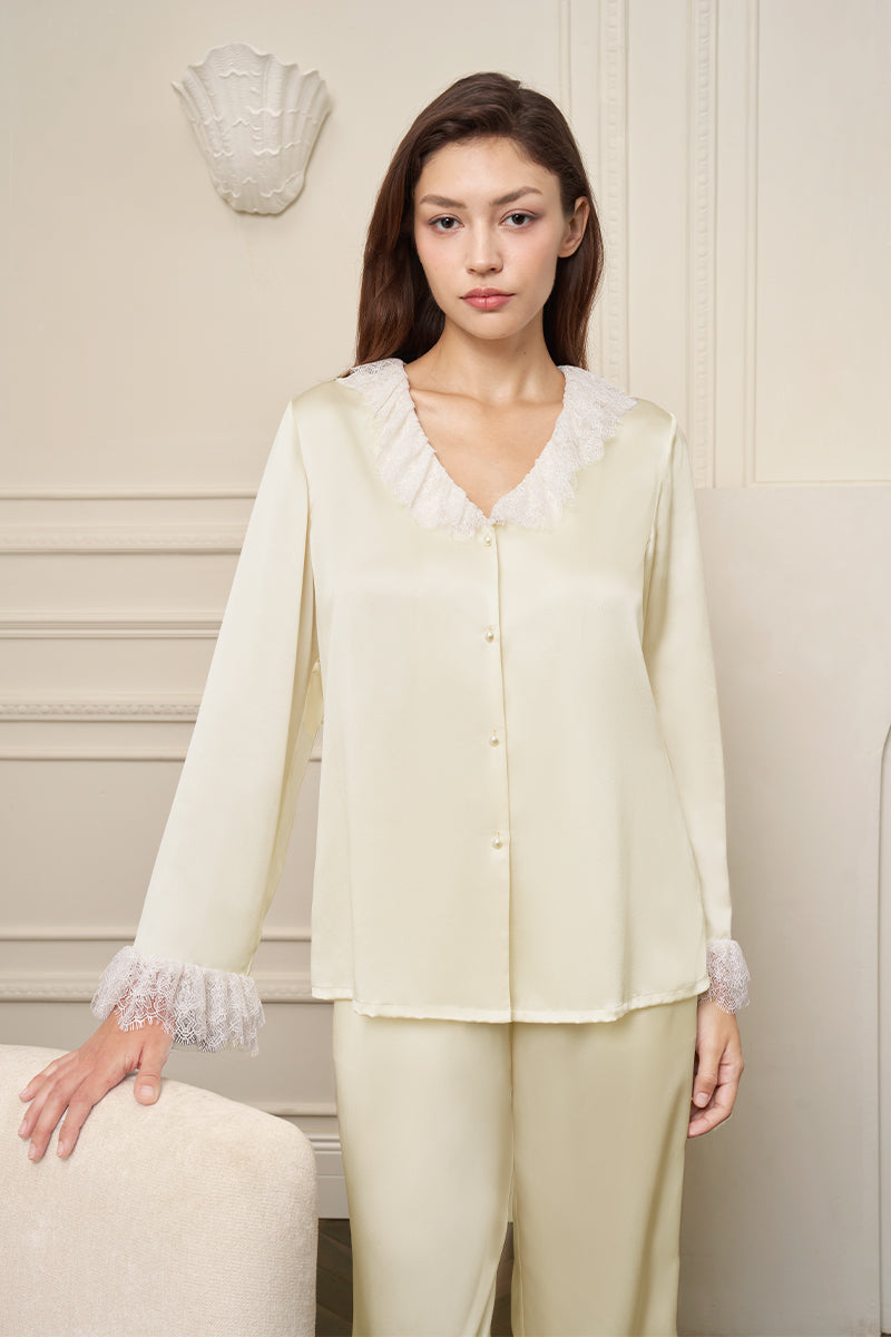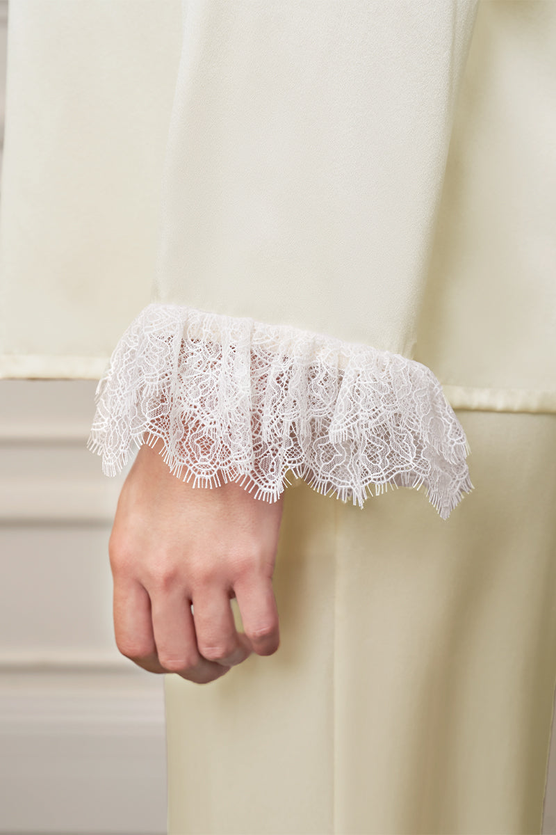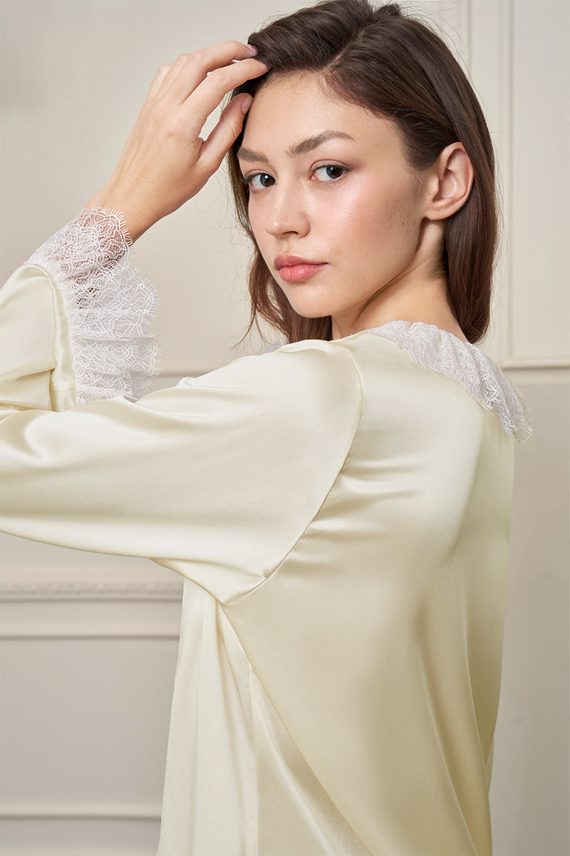 يمزج طقم ملابس النوم الفاخر هذا بين الراحة والأناقة. مصنوع من ساتان حرير التوت الفاخر بسمك 22 مم، ويتميز بتفاصيل دانتيل رقيقة على طول خط العنق والأكمام، مزينة بأزرار من اللؤلؤ الكريستالي لإضفاء لمسة راقية. تصميمه المريح والجذاب يمنحكِ حركة انسيابية مع تحديد دقيق للجسم. لمسات الدانتيل الرومانسية تُضفي على لحظاتكِ اليومية لمسةً من الأناقة الخالدة.