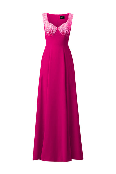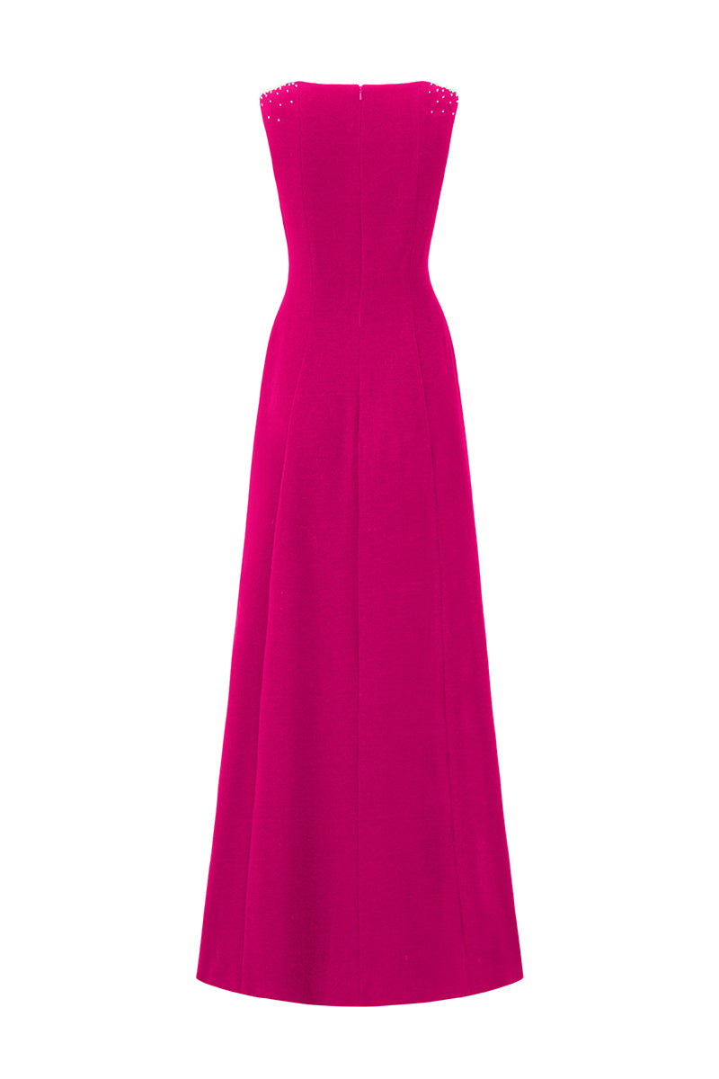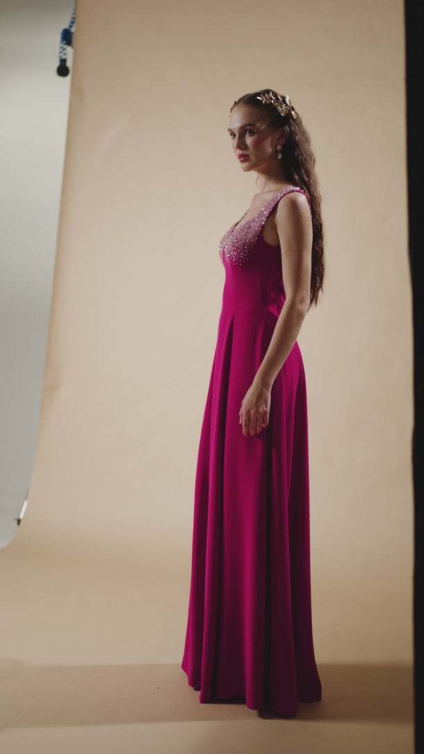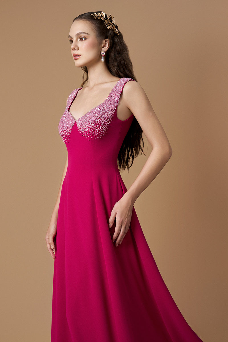 يُجسّد هذا الفستان المصنوع من قماش الكريب دي شين سحراً خالداً، ويُشعّ فخامةً راقية. ينساب تصميمه بقصّة حرف A بانسيابية على الجسم، بينما تُضفي الزخارف الكريستالية على الأشرطة الرقيقة والأكواب لمسةً من الفخامة العصرية. مثاليٌّ للأمسيات التي تتطلّب أناقةً هادئة وثقةً متألقة.