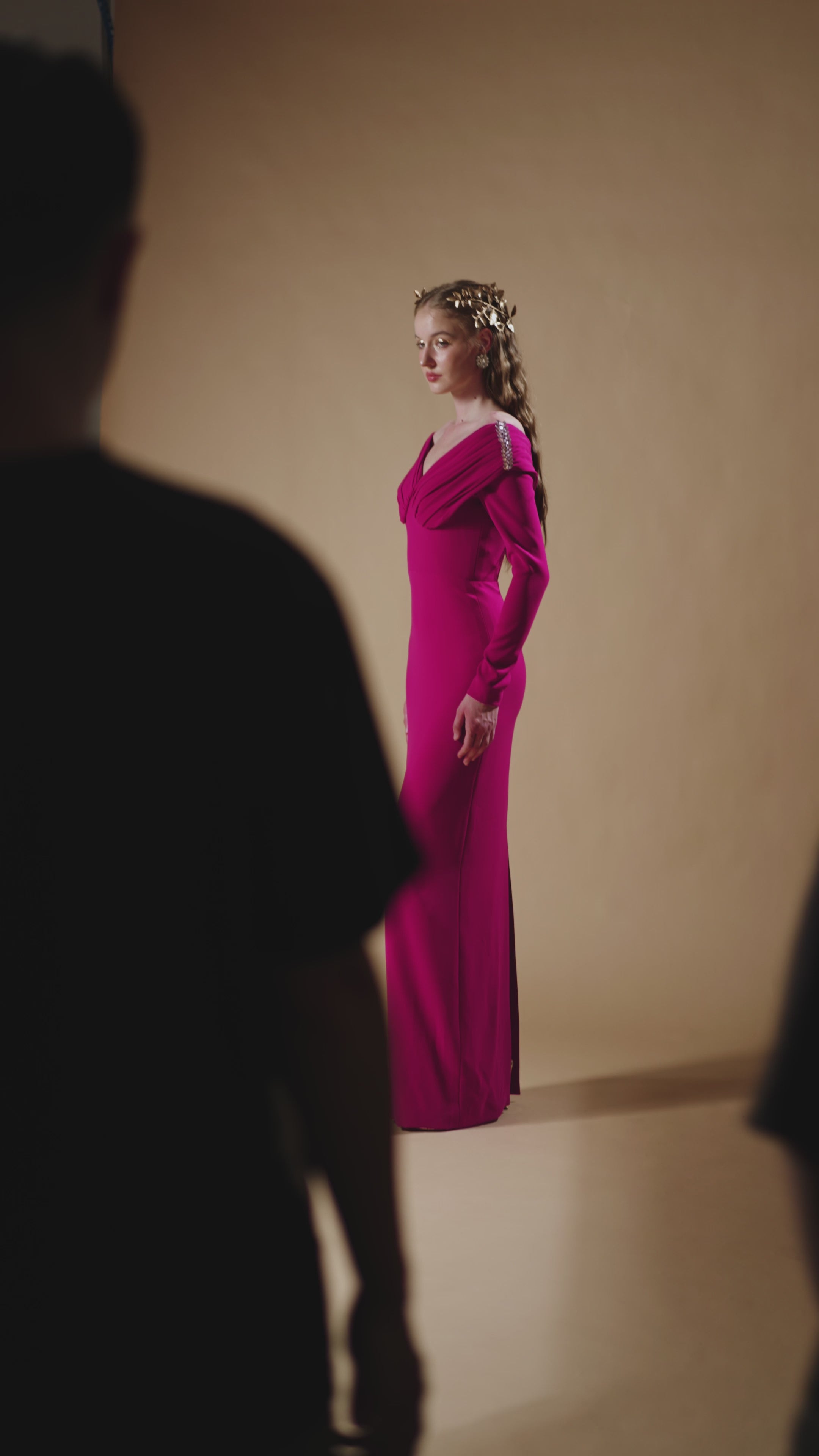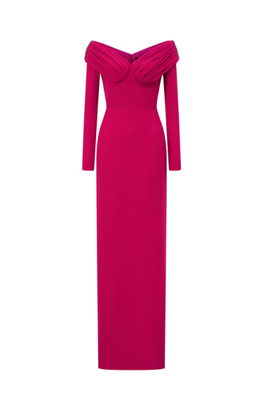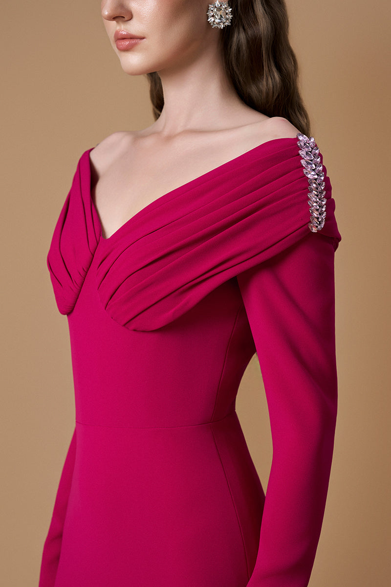 يُجسّد هذا الفستان، المصنوع من قماش الكريب دي شين المُبطّن بالحرير، رقةً وأناقةً أنثويةً، حيث ينساب بانسيابية في تصميم عمودي. تُضفي الأكمام الطويلة وفتحة الرقبة الأنيقة على شكل حرف V طولاً على القوام، بينما تُضيف تطريزات الأحجار الرقيقة على الكتفين لمسةً من الإشراق. والنتيجة تصميم خالد يمزج بين سحر الكلاسيكيات ورقيّ العصر الحديث.
