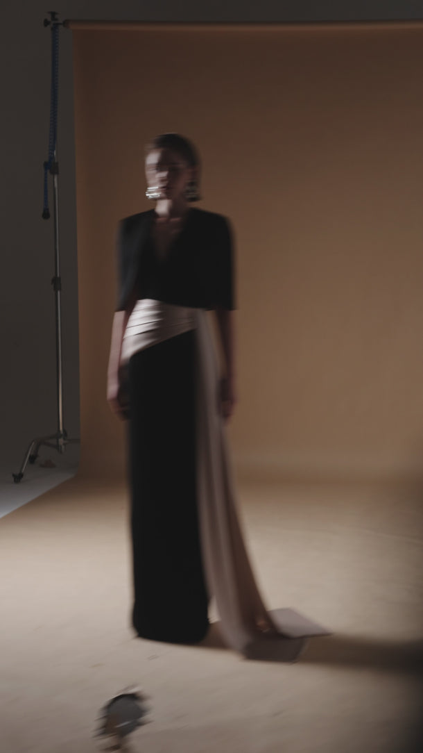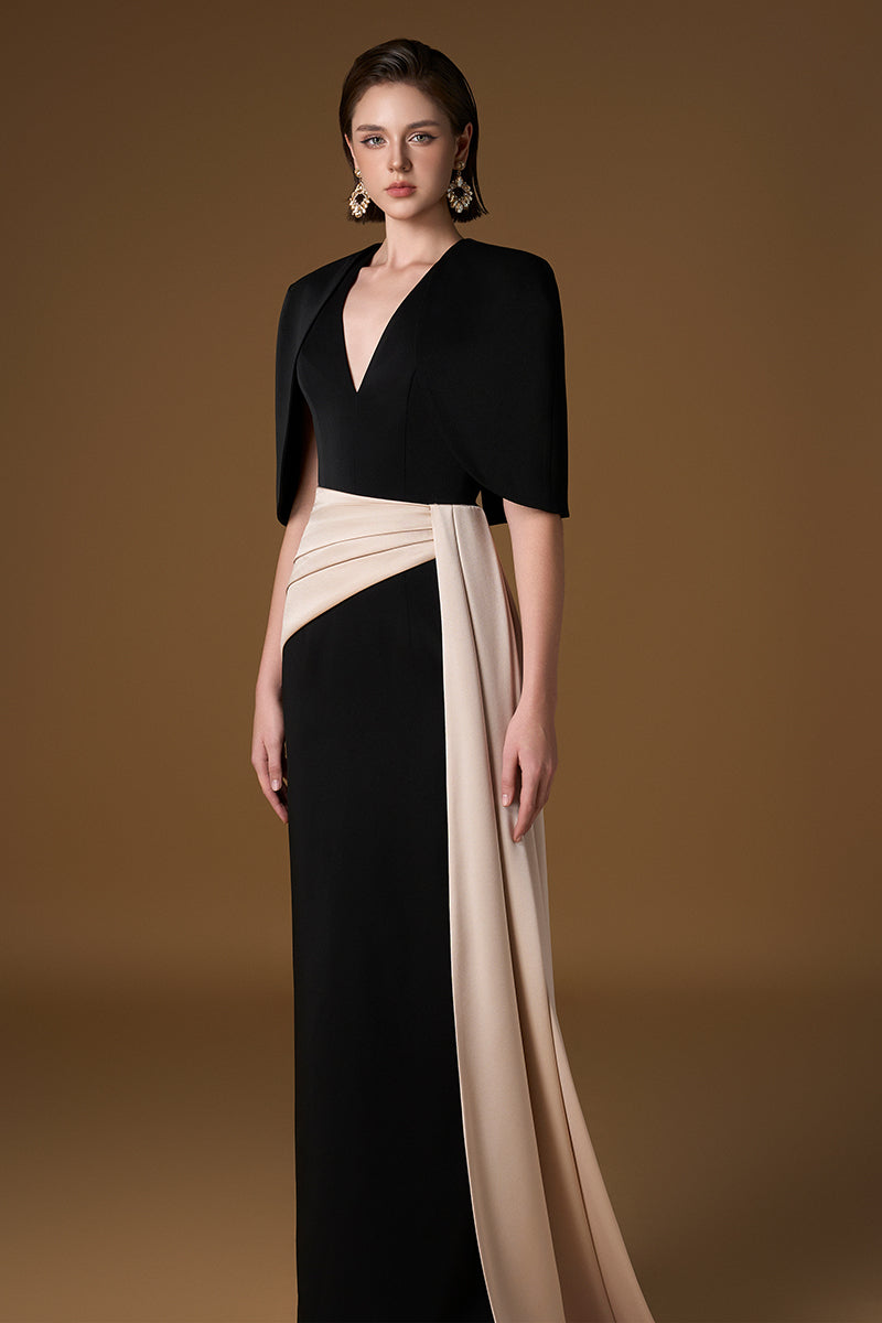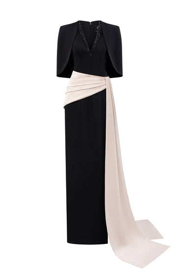 يُعيد هذا الفستان الأسود تعريف الأناقة الخالدة بلمسة عصرية راقية. مصنوع من الكريب والساتان اللامع، ويتميز بقصة عمودية أنيقة وأكمام قصيرة واسعة تنسدل برشاقة على الكتفين. يلفت خط العنق على شكل حرف V، المُزين بمجموعة من الكريستالات، الأنظار إلى منطقة الصدر، بينما تُضفي تفاصيل الثنيات غير المتماثلة بُعدًا راقيًا. إنه خيار مثالي لأي مناسبة مسائية فخمة، يُجسد الرقي والجاذبية الهادئة.