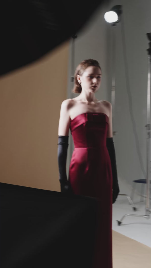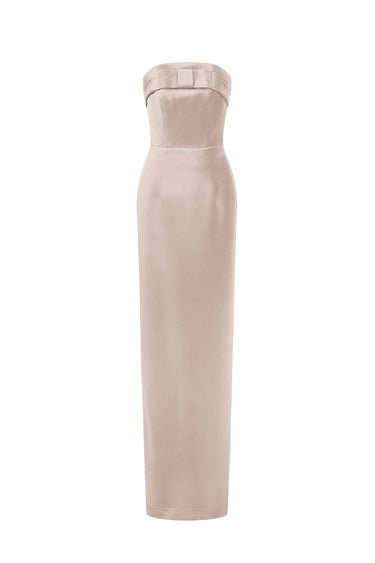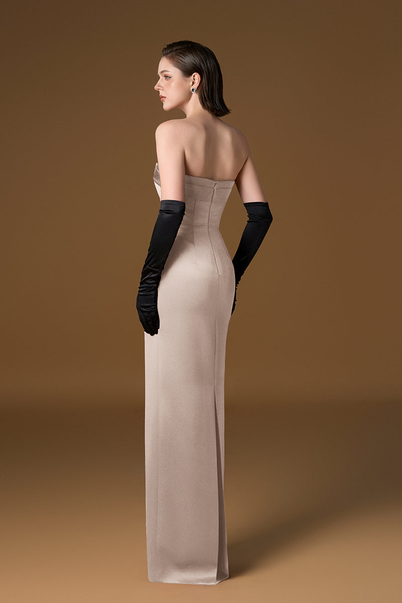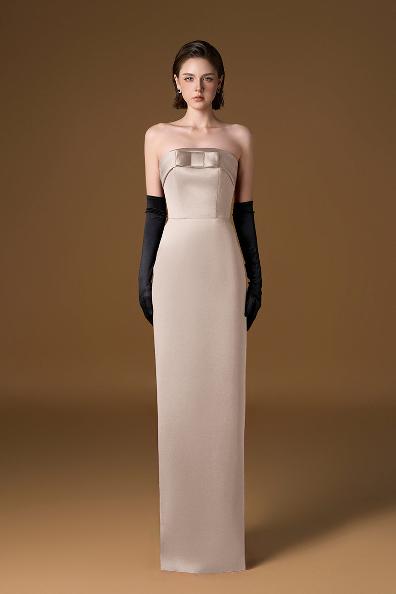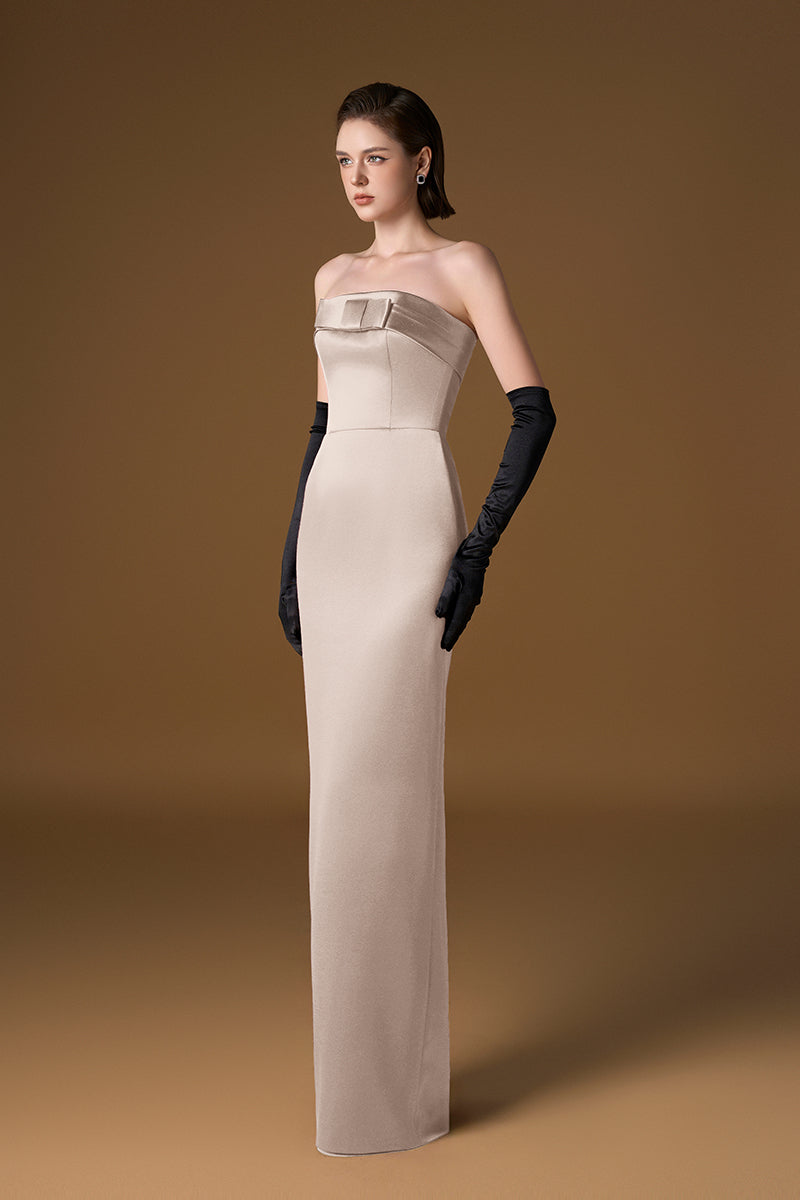 يُجسّد فستان السهرة العمودي بدون حمالات، المصنوع من الساتان اللامع، سحر الأنوثة العصرية بأناقة خالدة. يتميز الفستان بقصة منحوتة ولمعان ناعم، ليُعانق الجسم بانسيابية رشيقة. وتُزيّن ربطة ساتان بارزة حمالة الصدر، مضيفةً لمسة من الفخامة والرومانسية، مُجسّدةً الرقي والثقة الهادئة.